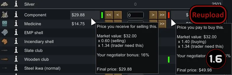 - Added a modifier of balance instead of just choosing selling price from minimum between buying and selling prices as vanilla does. It depends on difference between buying and selling price modifiers to ensure that a pawn with lower negotiator (social and shit) skill would not sell an item for higher price than another pawn with higher negotiator skill would. The lower the difference the higher the chance to see its effect.