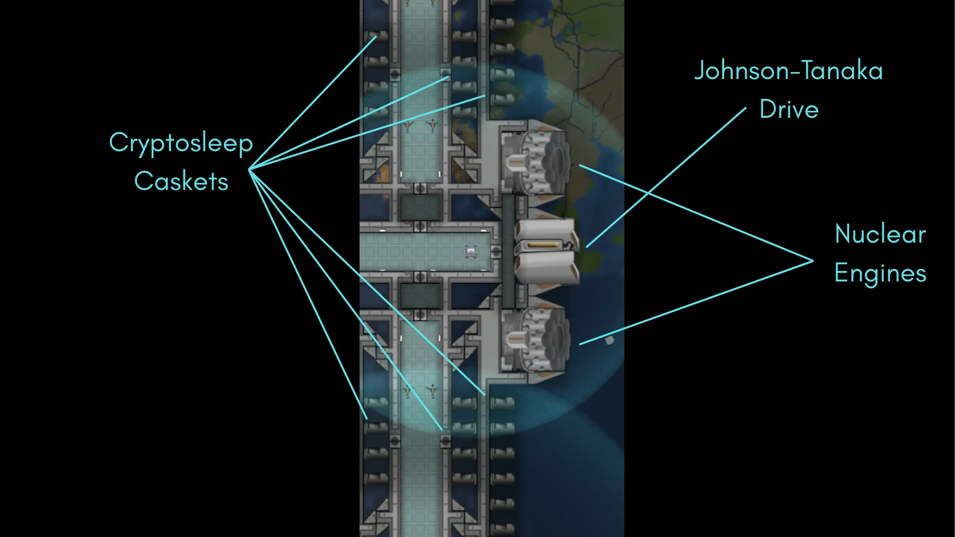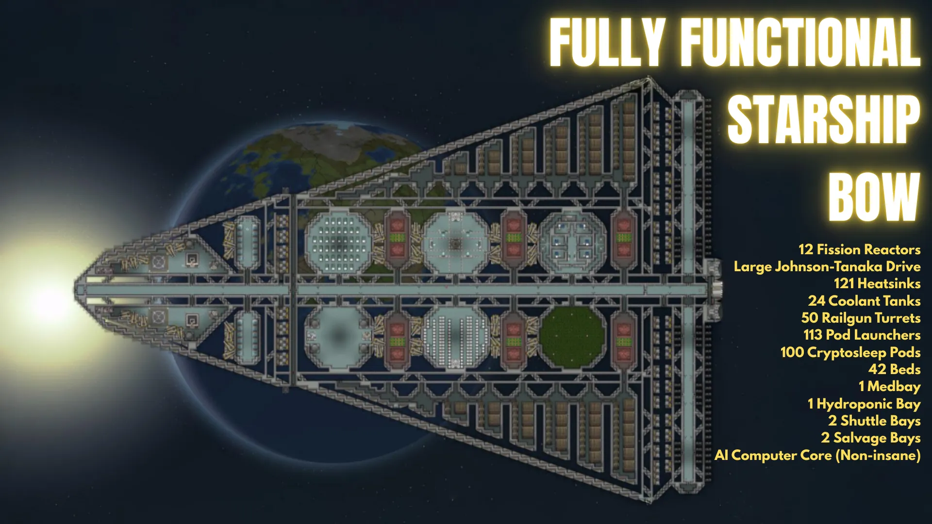 Warning ! Loading this ship in a starting scenario will result with your colonists waking from the cryptosleep pods on the back of the ship, in vacuum, so if you want this as as starting ship, make sure you have EVA ready.
