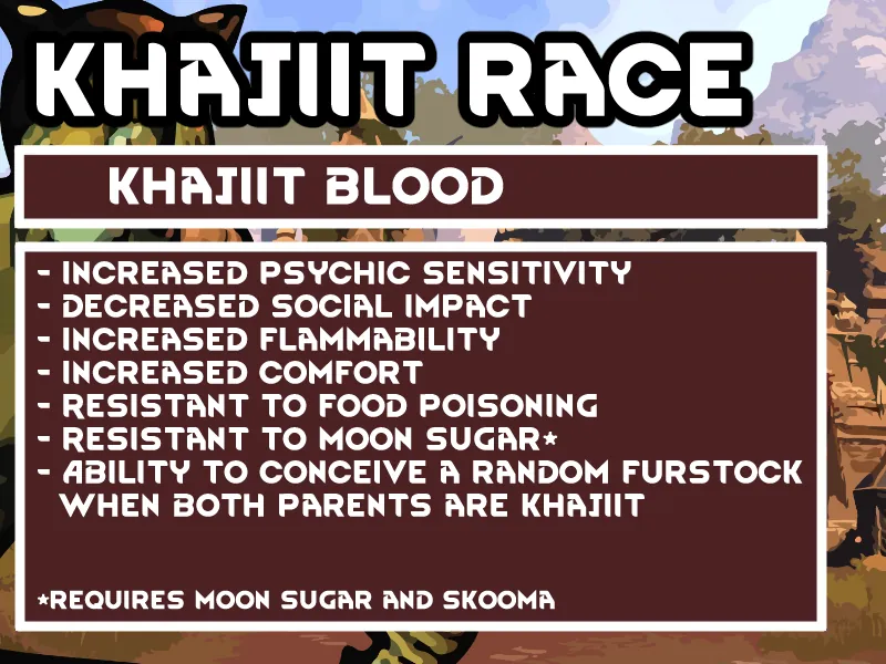 Khajiit are resistant to heat, and sensitive to mystical powers, but thanks to their unusual appearance and thieving ways, few dare to trust them.