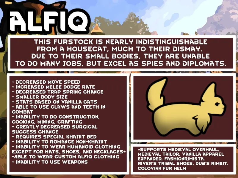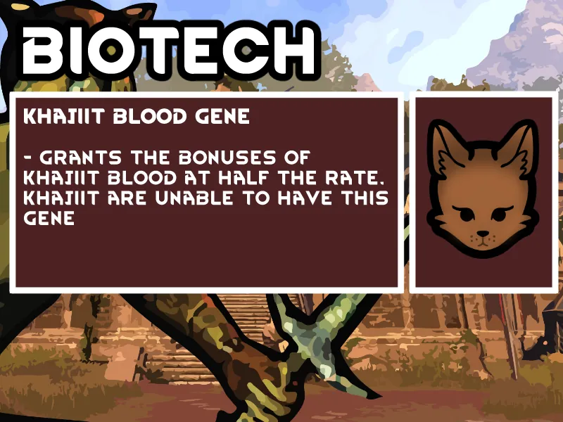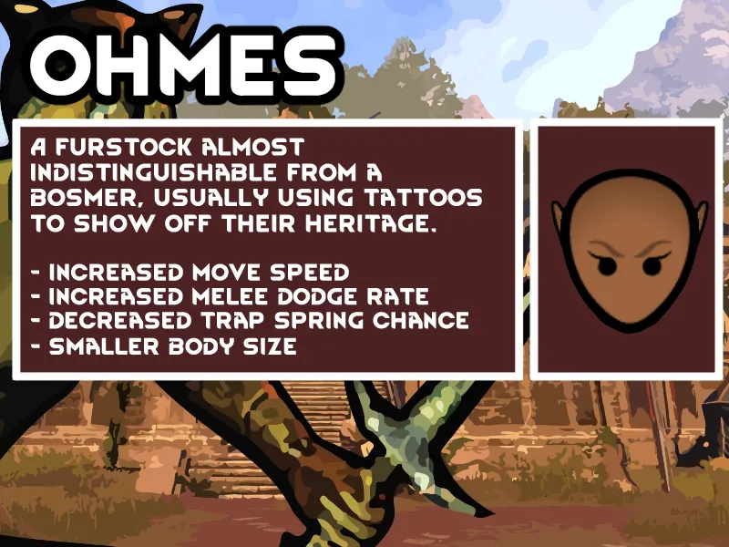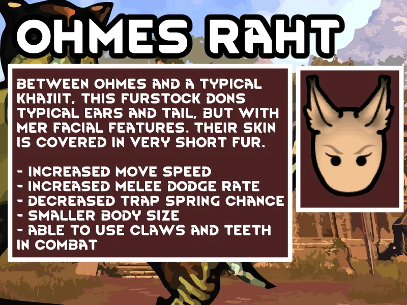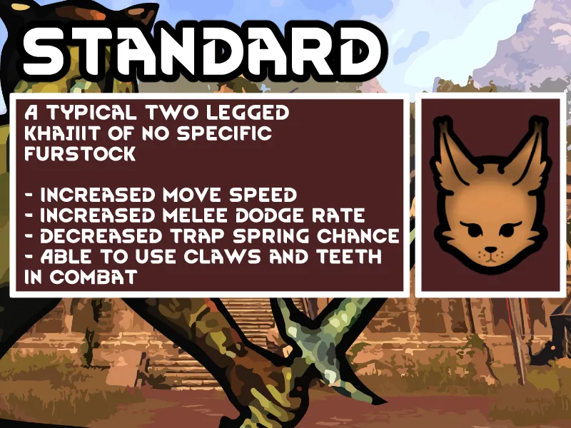 This mod adds Khajiit, the feline race native to Elsweyr from the Elder Scrolls Universe, by Bethesda Game Studios.