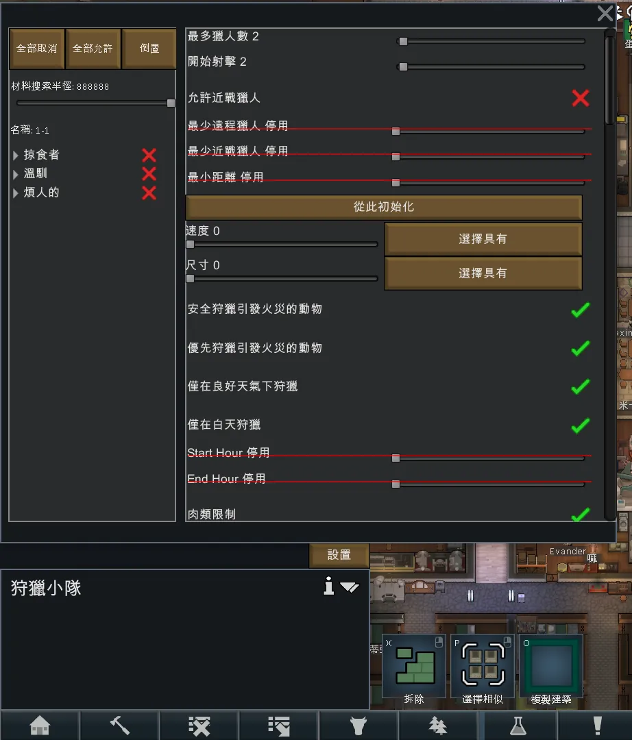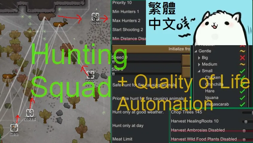 自己想玩的MOD沒有看到繁體中文 就自己丟給AI翻譯的小翻譯MOD 添加狩獵隊生產建築。 配置自動狩獵的動物列表。 加上生活品質自動化和煩惱消除。 狩獵時要組隊,因為單獨行動很危險。