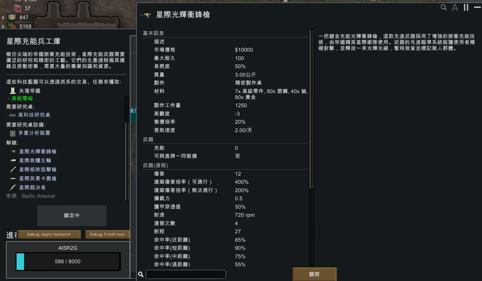 自己想玩的MOD沒有看到繁體中文 就自己丟給AI翻譯的小翻譯MOD 恆星武器庫 這些脈衝充電槍械是帝國為其 Stellic Guard 開發的最先進的 Ultratech 武器,專為保護帝國最重要的貴族和皇室而設計。每件武器都比前身有所增強,並配備了獨特的能力。 這些武器可以透過帝國的Techprint或其他「方法」來研究。