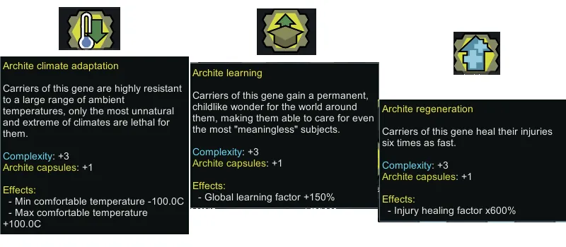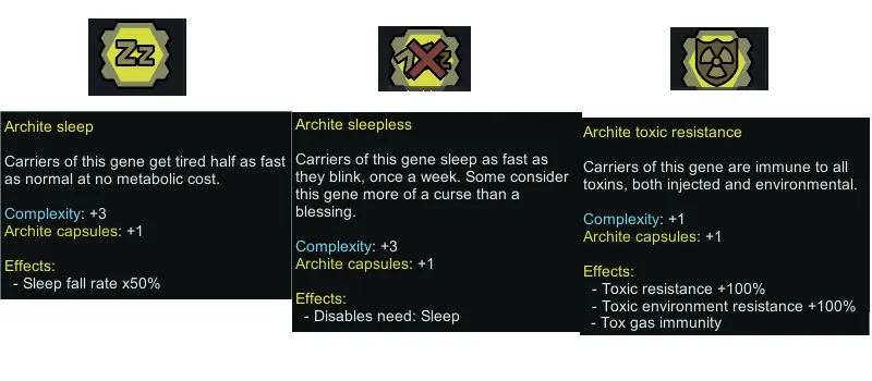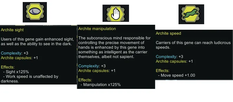 I was a bit disappointed by how the archite genes existed in vanilla purely to be used by vampires, and the mods I found that added more archite genes either had some features I didn't like, were too bloated or just didn't scratch that "literally just normal genes but better and not costing any metabolism" itch.