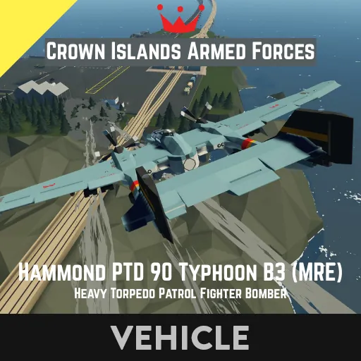 A two seat four contra-rotating turboprop medium range maritime patrol torpedo bomber built by the fictional Hammond Company for the Crown Islands Armed Forces. Designed in the 1990s as a cheaper, more maneuverable, alternative to larger more dedicated airborne early warning, command and control, aerial reconnaissance, and anti-submarine aircraft found in larger, more economically prosperous countries. The PTD 90 Typhoon works best utilizing Boom and Zoom tactics, striking maritime targets from low elevations and using its superior speed and agility to swiftly gain altitude and fly out of harm's way. This aircraft is nearly fully functional with a lone Pilot but works best when flown with a Pilot and rear RIO Operator.