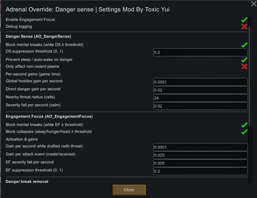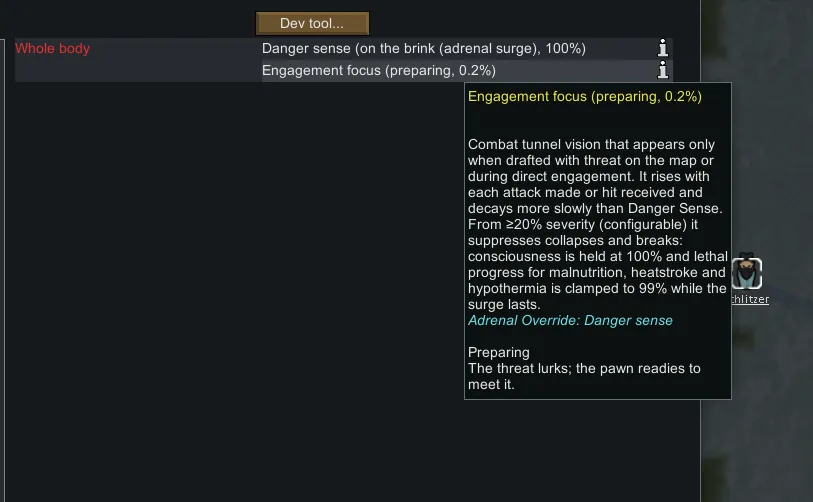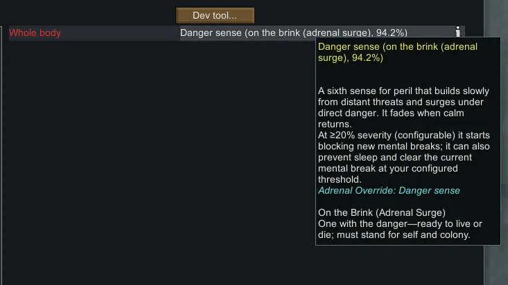 [*] [b]Danger Sense:[/b] Builds when trouble is nearby and [b]blocks mental breaks[/b]. Also nudges pawns away from sleeping in unsafe spots. Fades when the map is calm.