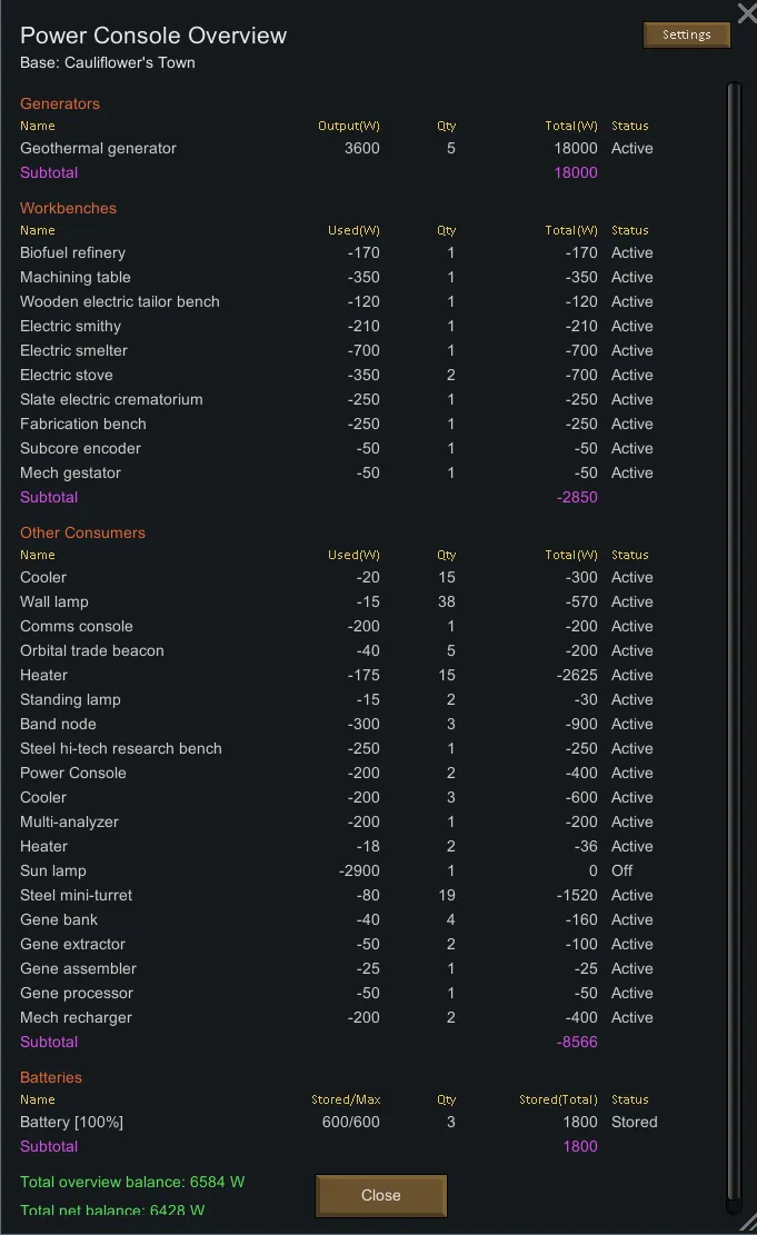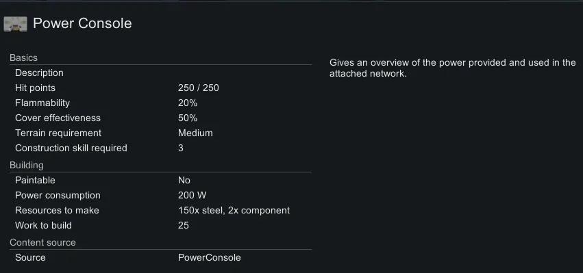 This mod adds a Power Console to the game which allow you to get an overview of the generated and used power of the linked network.