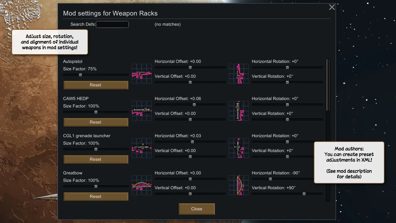Mod settings allow you to adjust the size, position, and alignment of individual weapons in different orientations for the perfect presentation!