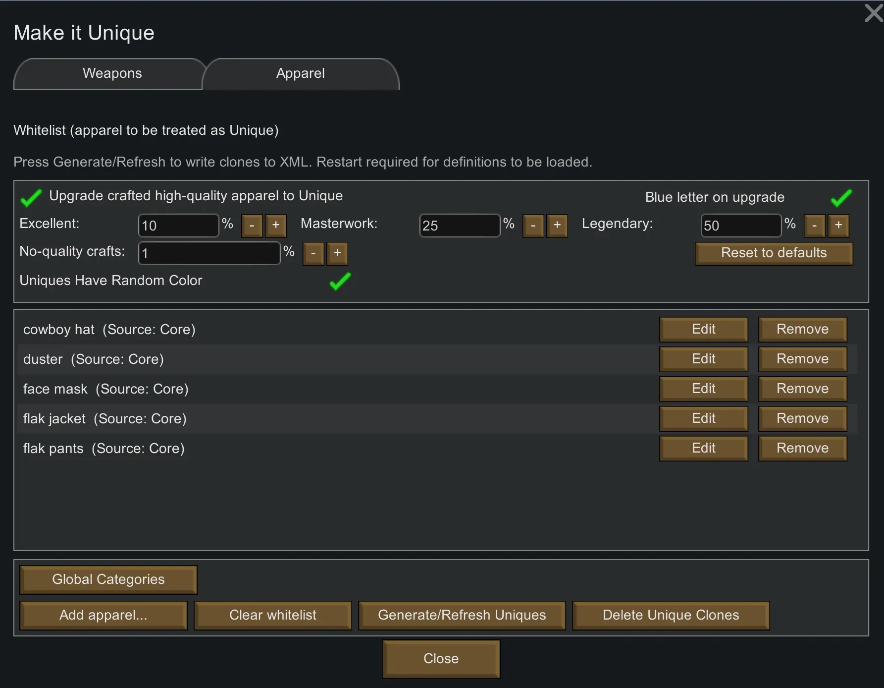 * Note: After changing global toggles, click Generate/Refresh (Apparel) and restart to rebuild the XML and load the new pool.