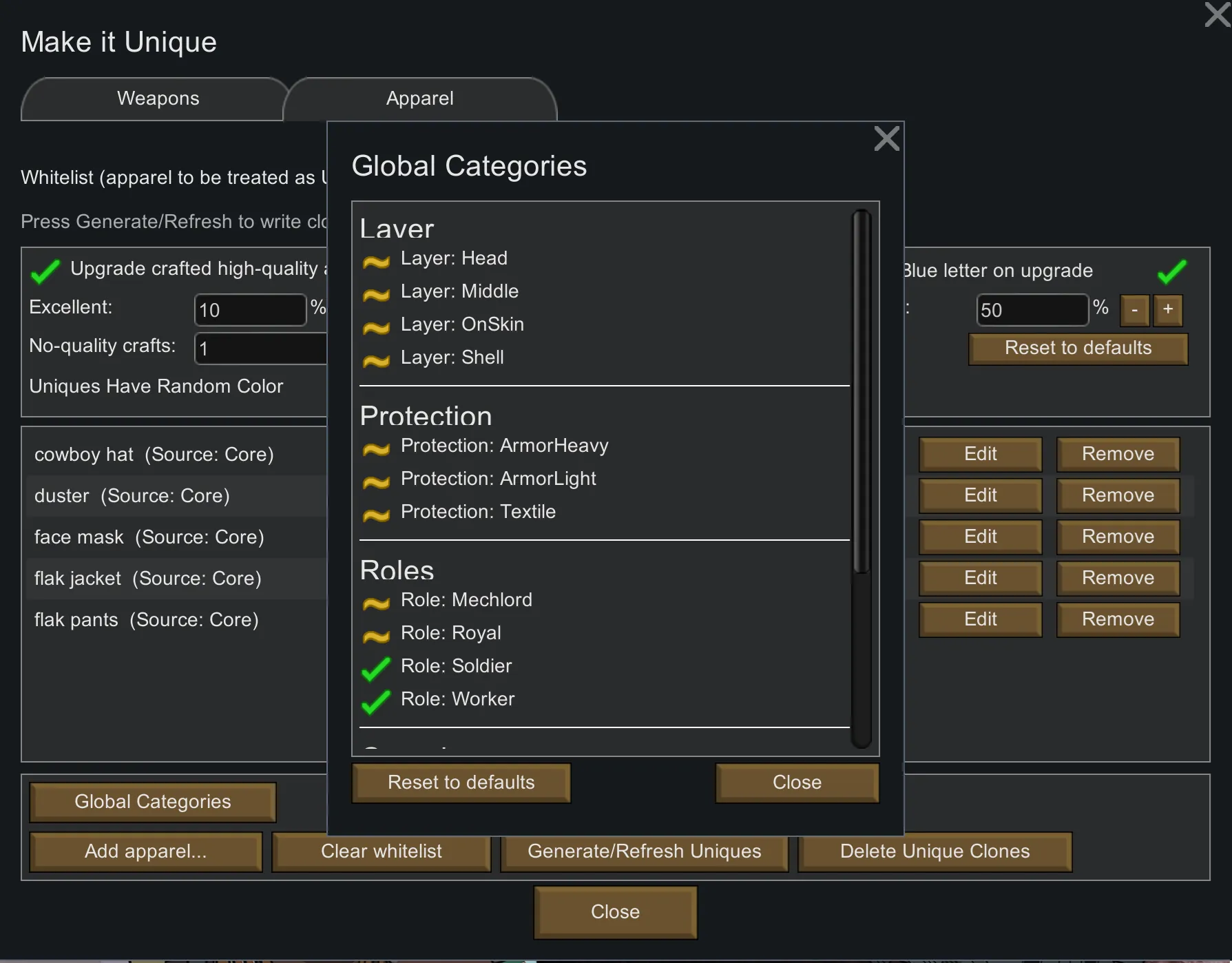 * Deleting generated apparel uniques removes those defs; any items using them will disappear until regenerated.