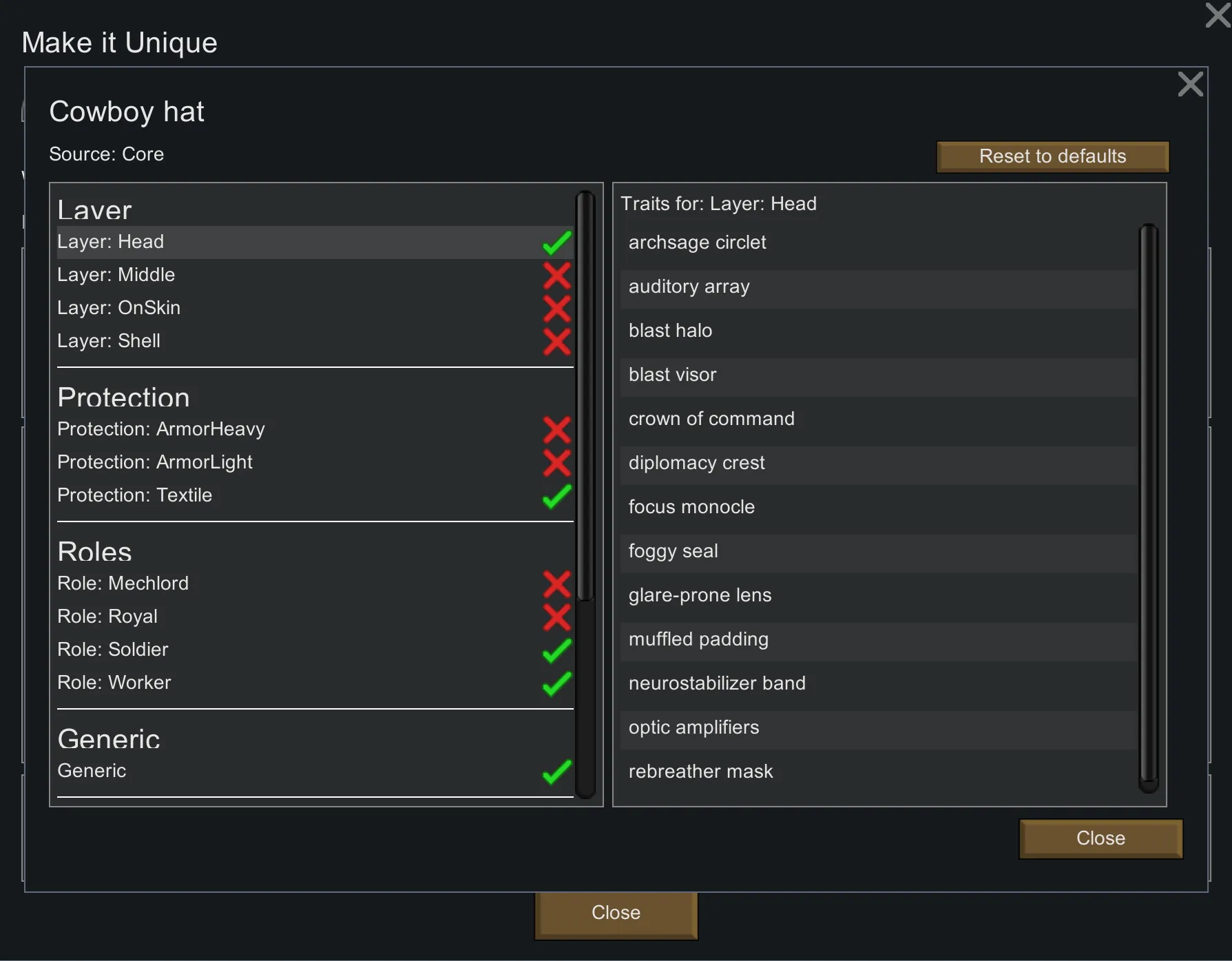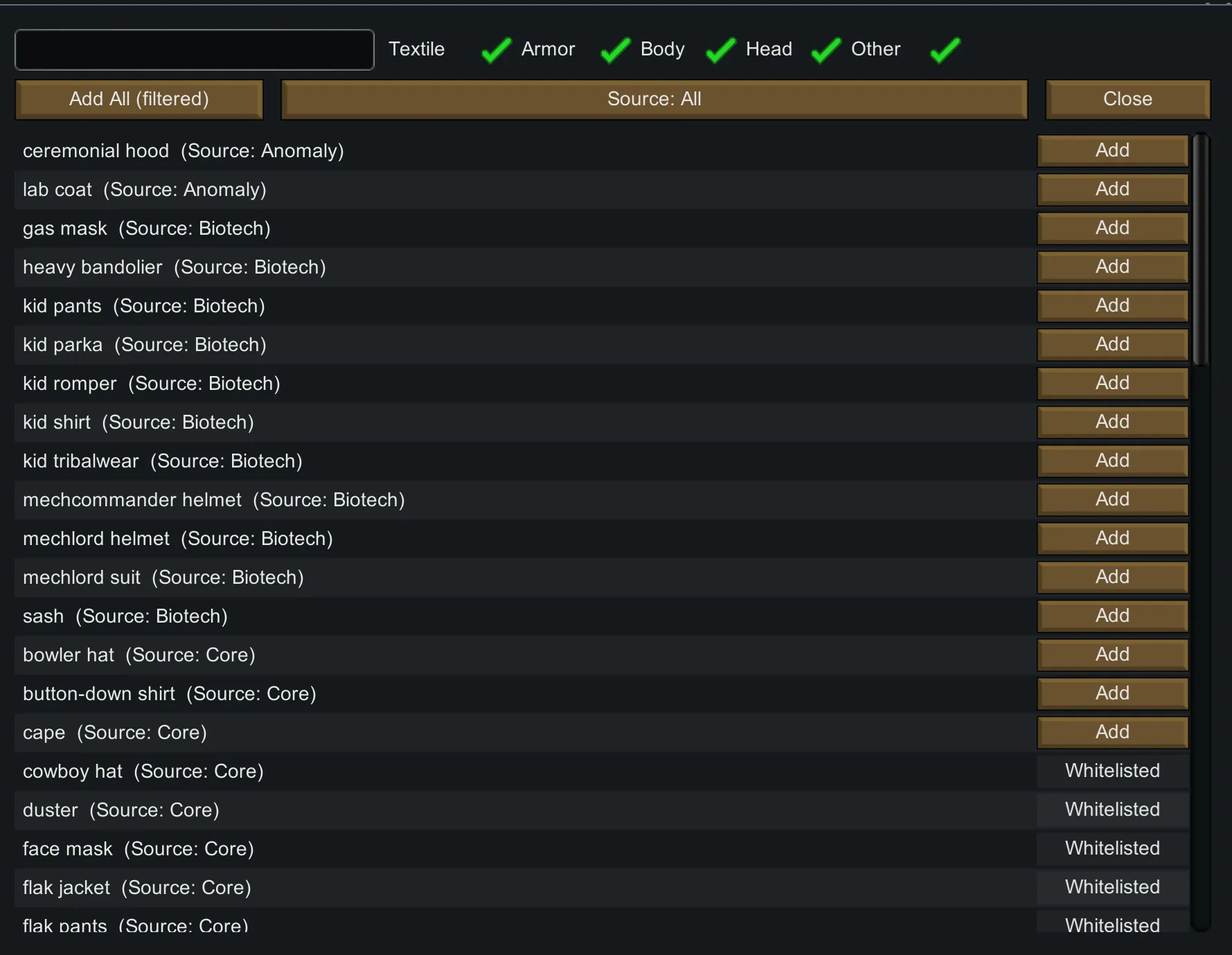 Master filter: Globally enable/disable whole category families (e.g. On-skin/Middle/Shell/Head layers; Textile/Light/Heavy; Worker/Soldier/Royal, etc.).