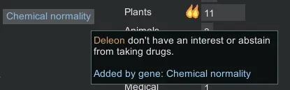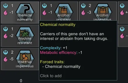 This adds a gene which makes chemical interest/fascination and Teetotaler Suppressed. There is also a trait, BUT it should generate normally, and should only be added if you have the gene.