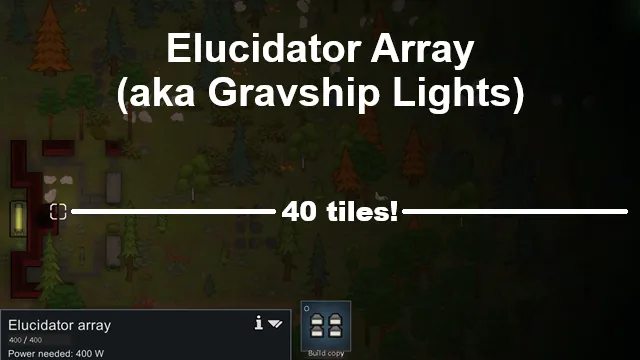 Elucidator arrays are located in the Furniture category by default once Fabrication research is completed. To balance their utility, elucidator arrays take 80 steel, 4 components, 1 advanced component, and 10 gold to build, can only be wall-mounted, can't be built under a roof, and require a Construction skill of at least 8 to assemble. Elucidator arrays draw 200W of power when activate and can change color or function as darklights.