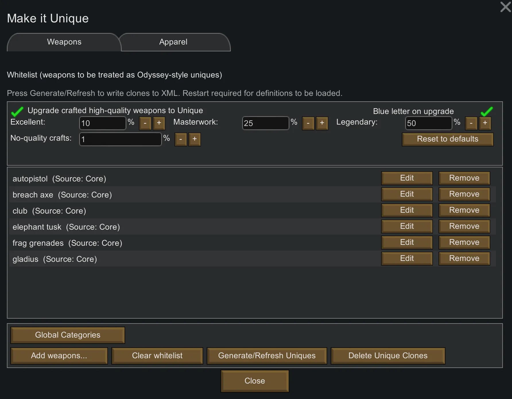 -High Quality Crafts (optional) - if toggled on, crafted items of excellent or higher quality have a chance to roll as the unique variant of the weapon. There is an additional option for weapons with no quality (i.e. clubs) to also roll as their unique variant. When a non-quality item gets its unique variant, it will have quality applied to it as well, so legendary unique clubs can be created. If unique variants are from Odyssey or other mods, crafting the base non-unique version of the weapon has a chance to roll it into the unique that Odyssey or other mod's created.