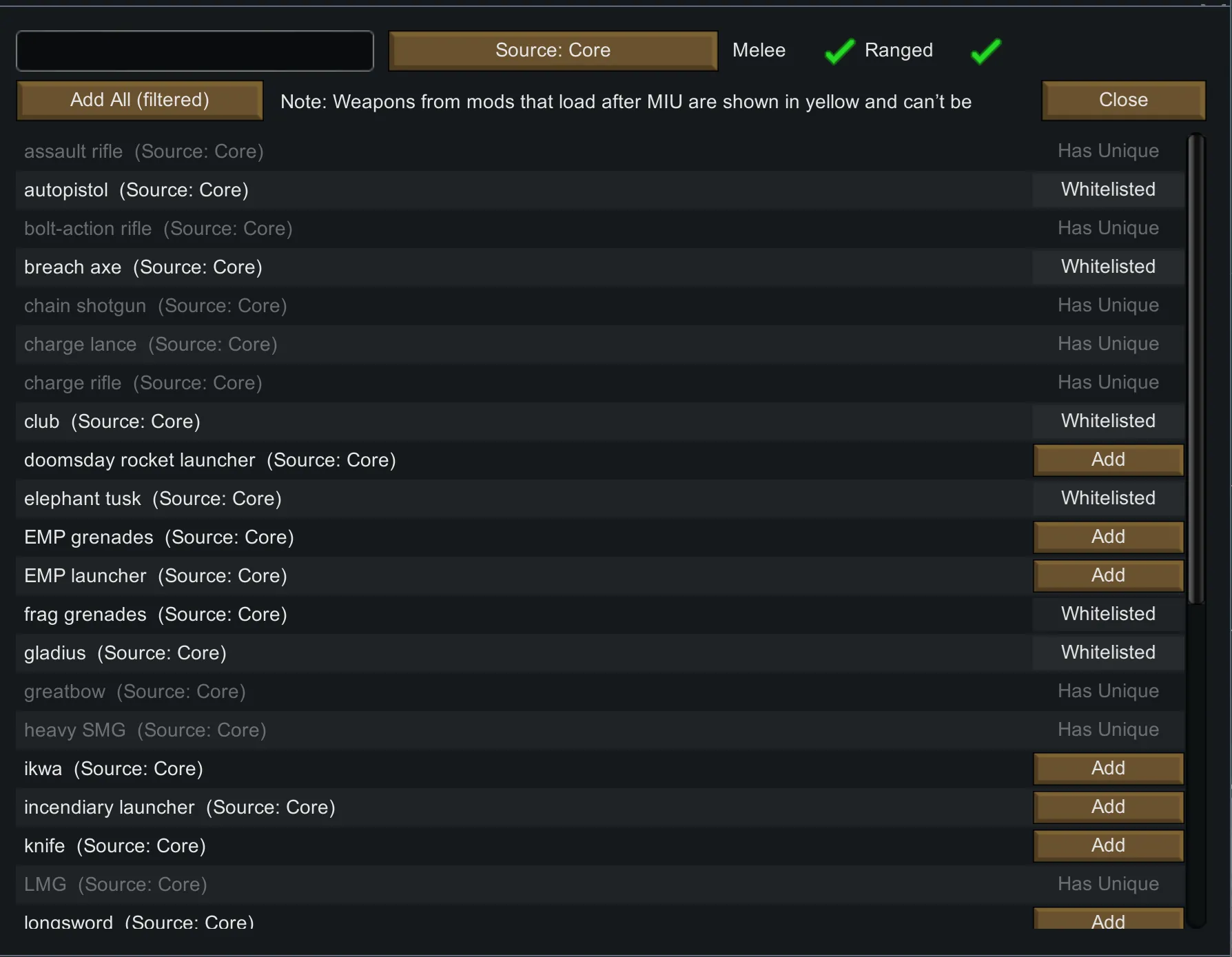 A: Make It Unique has to be loaded after any mod that adds weapons for them to show up. Or if weapons can be consumed (like beer) or used as stuff (woodlog), I filtered them out because they were causing issues.