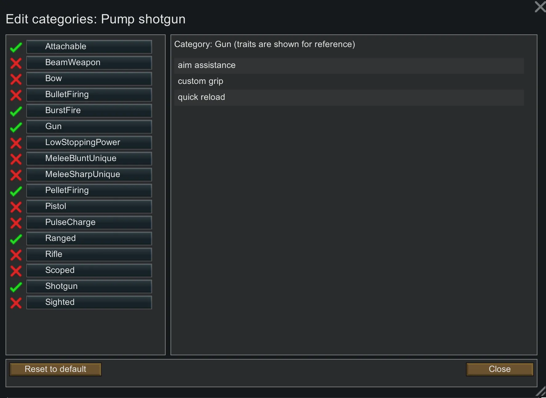 * As other mods start adding their own weapon categories and traits, this mod can detect them. This allows you to assign those modded categories and their associated traits to any weapon of your choosing. I noticed it working for the Big and Small mod series weapons and the Det's weapons series mods.