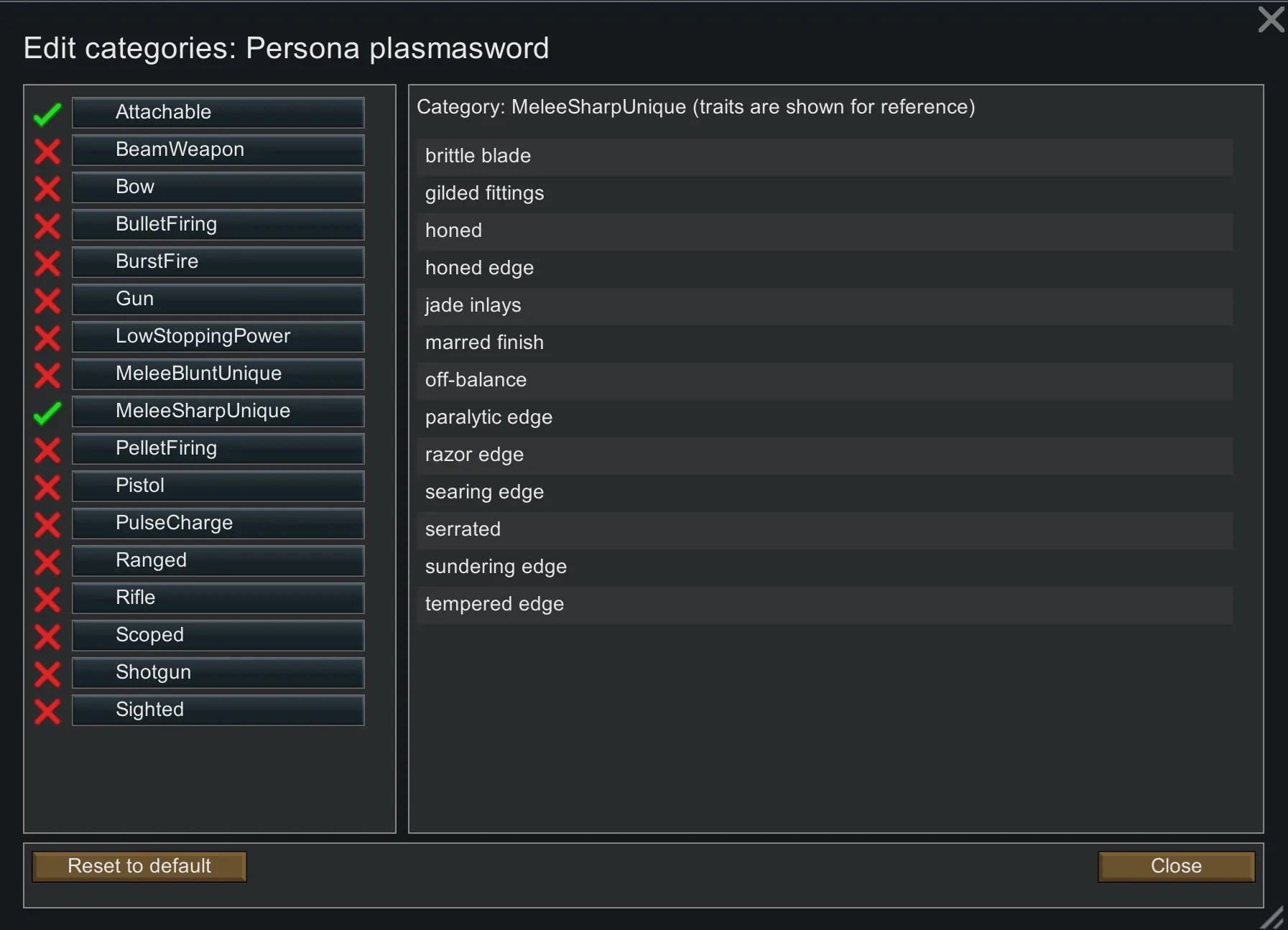 * Want to disable a specific trait in your load order? Use Cherry Picker (or any trait blacklist tool). Doing specific trait editing per weapon would require creating too many defs and caused issues in testing.