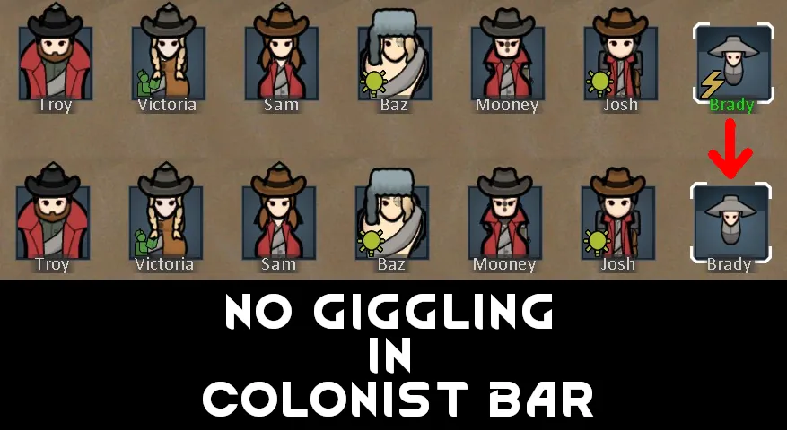 The game shows giggling as other mental states in the colonist bar, which is distracting, as there is no problem with this mental state. Even worse, giggling is shown exactly the same way as crying.