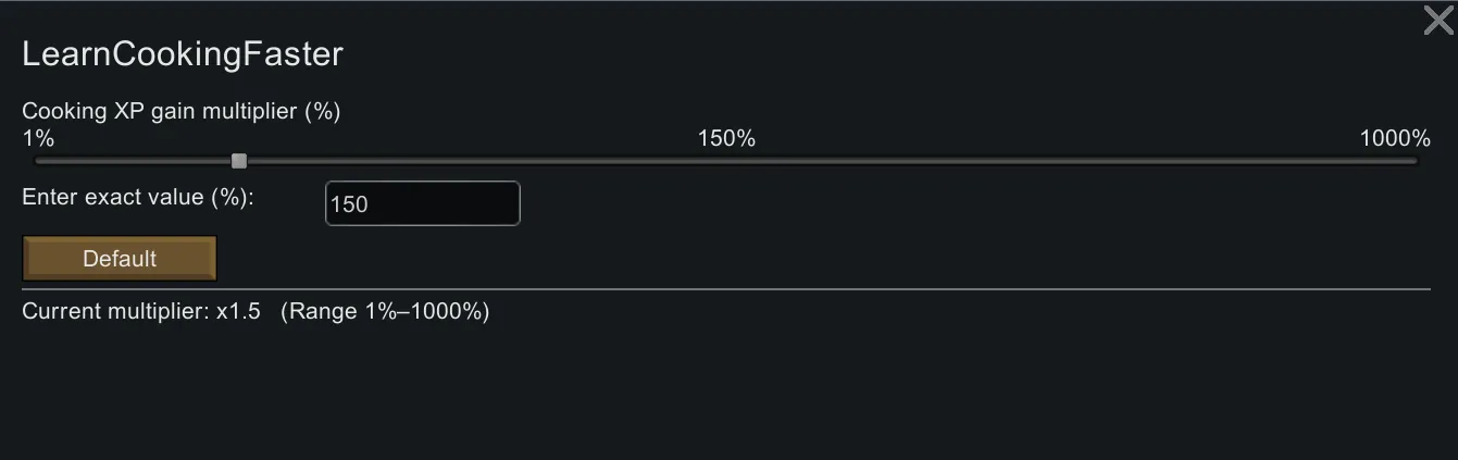 [*] This mod adds a simple slider in the mod settings that allows you to add a multiplier to the cooking learning speed (default 150%)