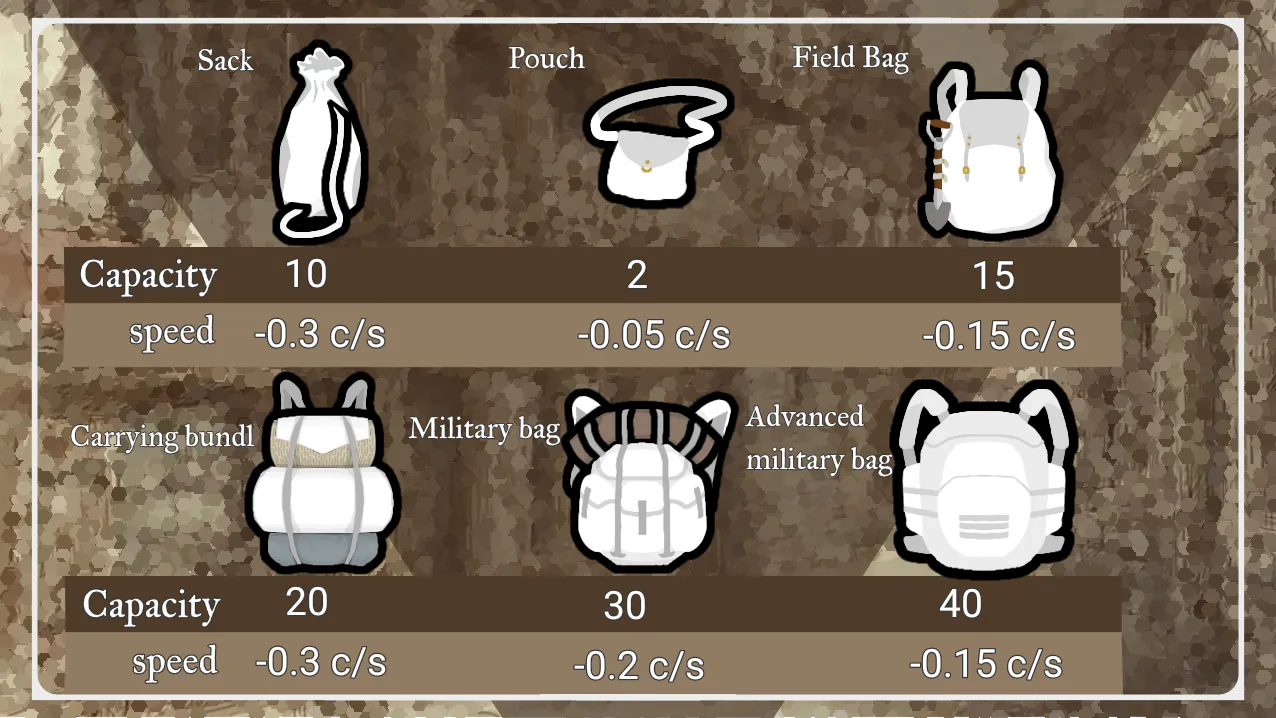 This mod adds bags that are useful across various eras. Additionally, the weight of the bags has been adjusted to reflect realistic values based on kilograms (kg).