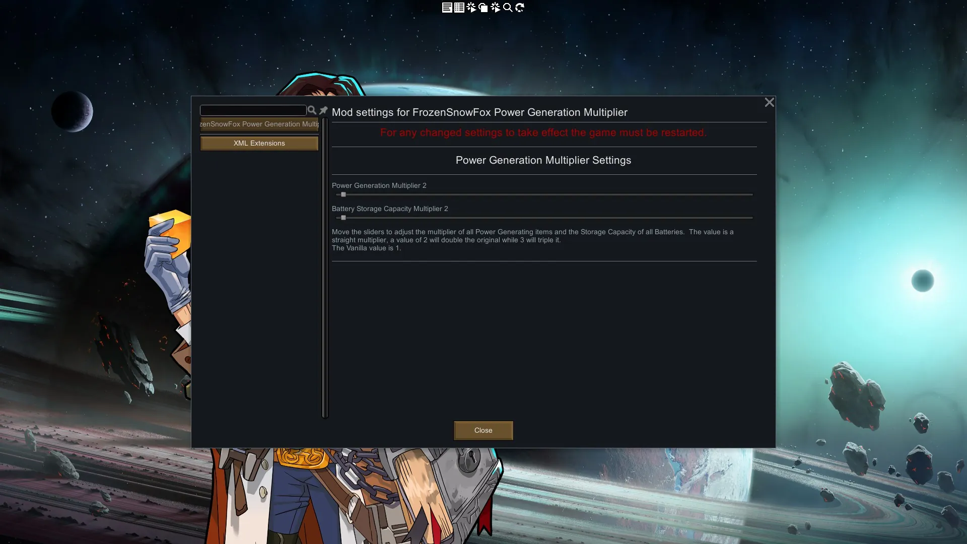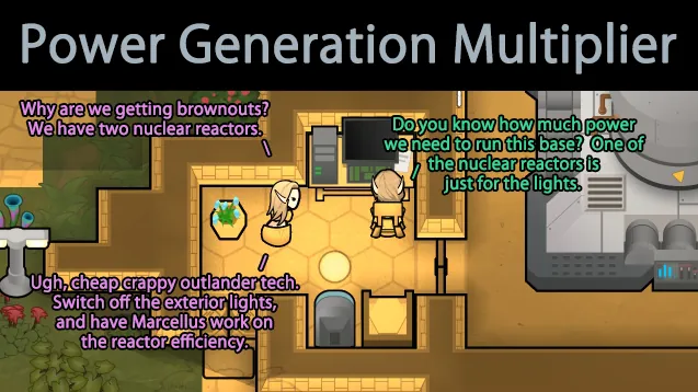 This mod allows you to multiply the power generation of all Power Generating items and the Storage Capacity of all Batteries by an input value. It works for all power generating items from the base game, mods and even vanometric power cells. It's a very simple and highly compatible alternative to changing the power draw on individual items.