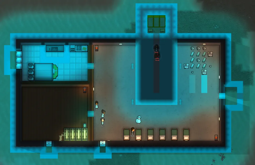 They seal rooms, hold roofs, block weather, and insulate temperature just like regular walls, but attuned pawns phase through without stopping. Toggle them off and the field drops to a floor plate while the emitter keeps holding the roof. Kill the power and they're gone entirely.