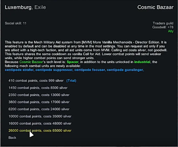 [*] [b]Silver-Funded Firepower:[/b] Call in mechanoid military aid from allied high-tech factions.