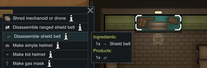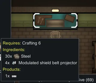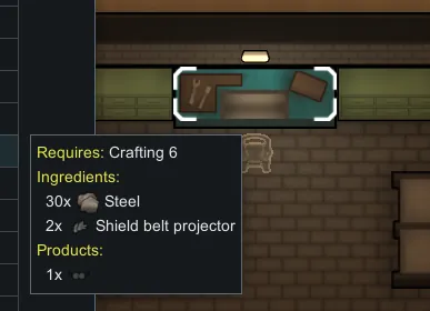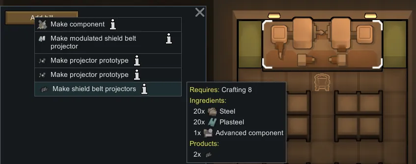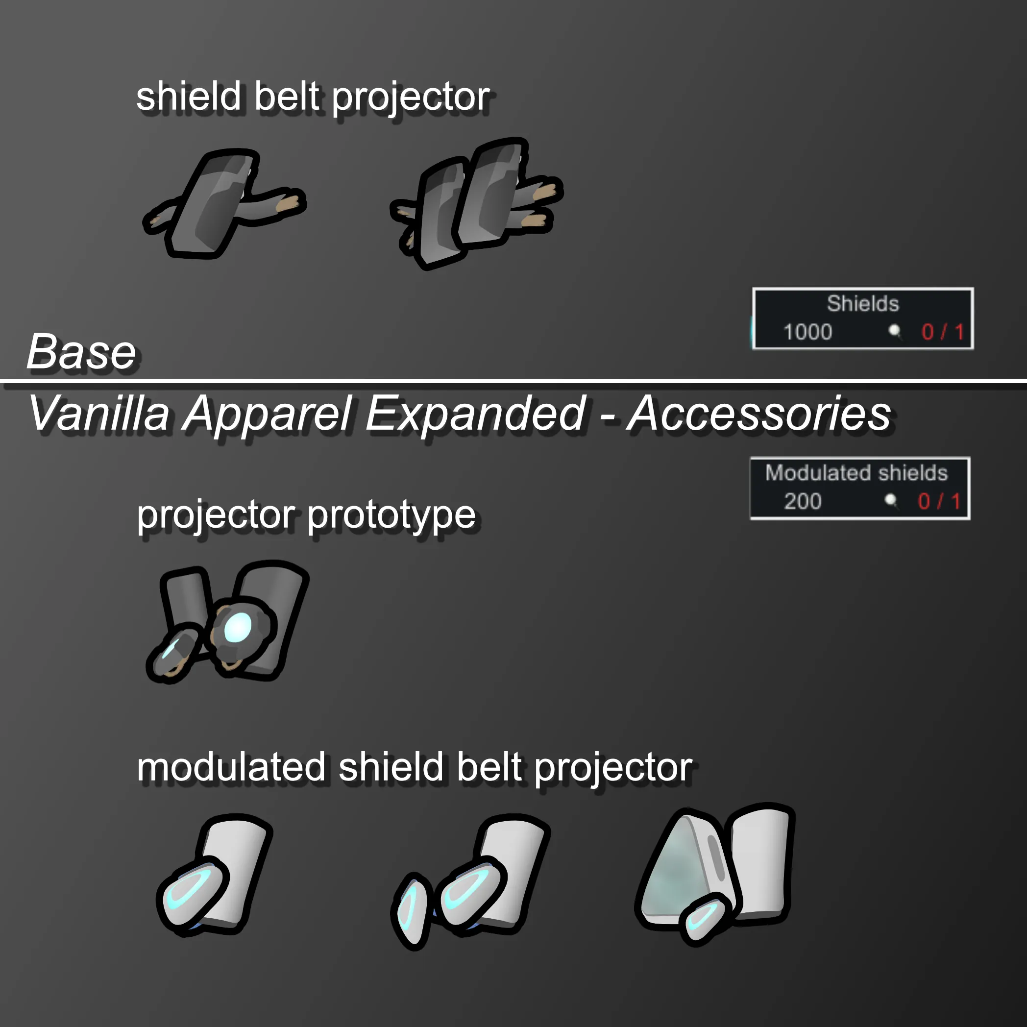 If the mod "Vanilla Apparel Expanded - Accessories" is enabled, ranged shield belts require modulated shield belt projectors. I find that ranged shield belts way too easy to get for being game-breaking. With this mod, I want ranged shield belts to resemble mastery over shield technology. A new research project "Modulated Shields" grants the knowledge to craft modulated shield belt projectors, but unlocking it requires analyzing a projector prototype. Making a prototype is meant to be a personal project of one of your skilled crafters (10~12+ in crafting) in which they experiment over a longer time period (meaning a crafting recipe with high work amount). A skilled crafter must expend 4 regular or 1 modulated shield belt projector and a lot of time to make one. Note that you can still always buy ranged shield belts or modulated projectors from traders. Making a prototype from a modulated projector significantly cuts down work.