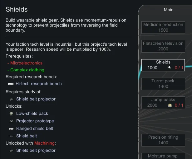 Researching shield belts only grants the kownledge to calibrate and wire projectors, allowing your colonists to assemble the belts using the projectors. However, crafting projectors themselves requires additional effort. Projectors can be attained by trading, disassembling shield belts at a machining bench, or crafting your own at a fabrication bench (after researching "Shields"). The "Shields" research project will require your colonists to analyze a shield belt projector. The core idea is that while assembling a shield belt is possible with industrial-level tools, your colonists can't craft the vital parts needed without spacer-level tools.