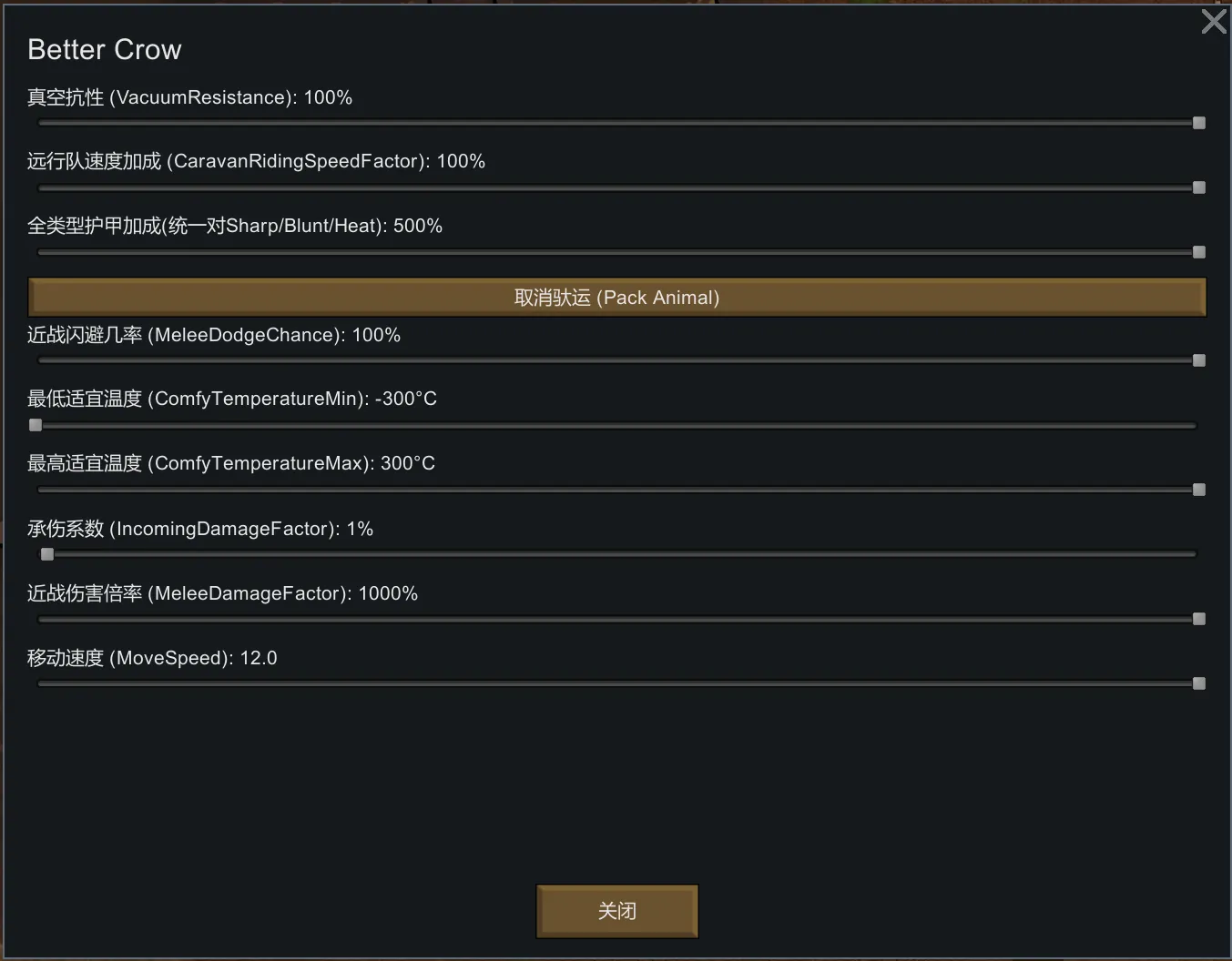 9. Added a series of adjustable parameters such as Vacuum Resistance, All-type Armor, Damage Multiplier, Melee Damage Multiplier, and Max/Min Comfortable Temperature.