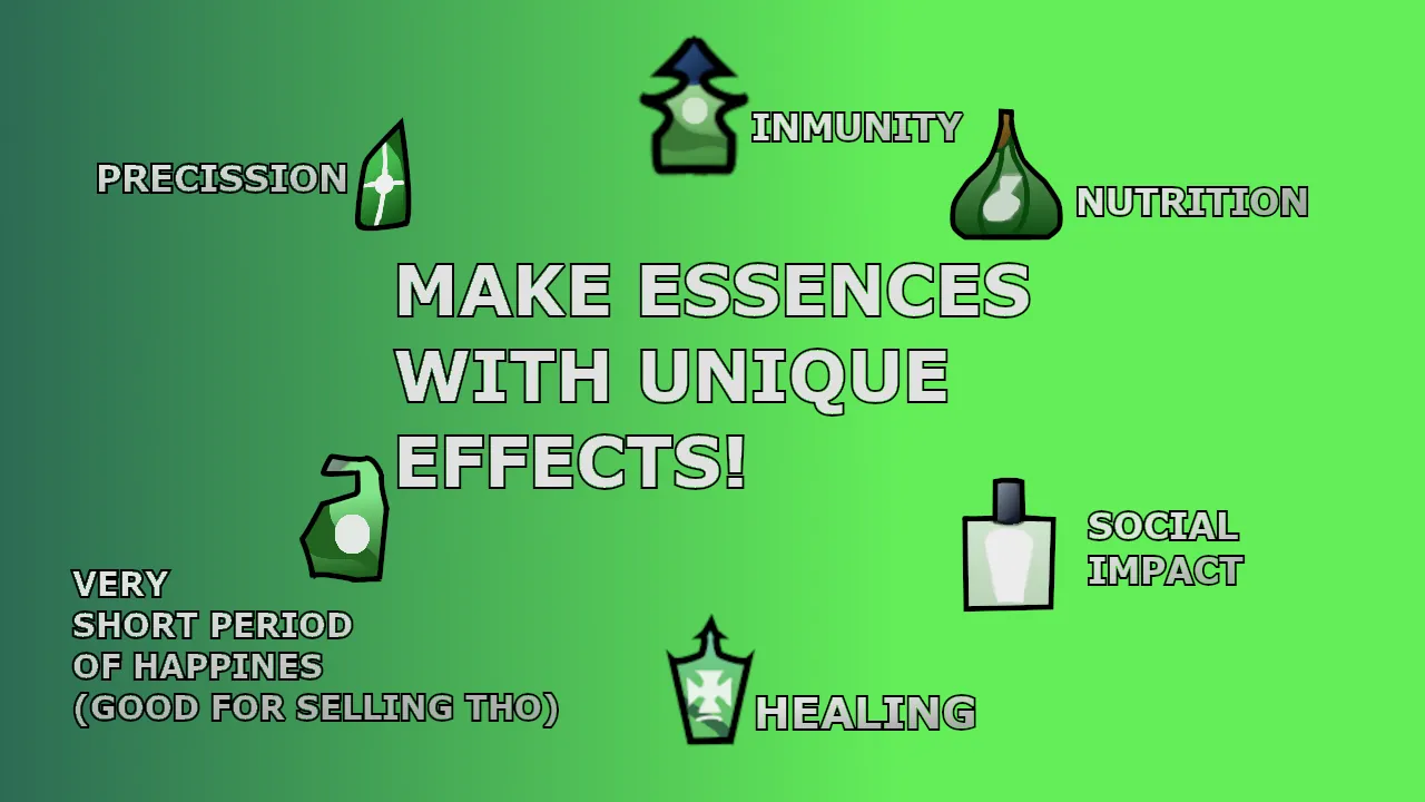 Essences are drinks that vary between bland, delicious, and disgusting, but with a bunch of benefits. Although they are more expensive and refined than simple snacks. Among them we have: