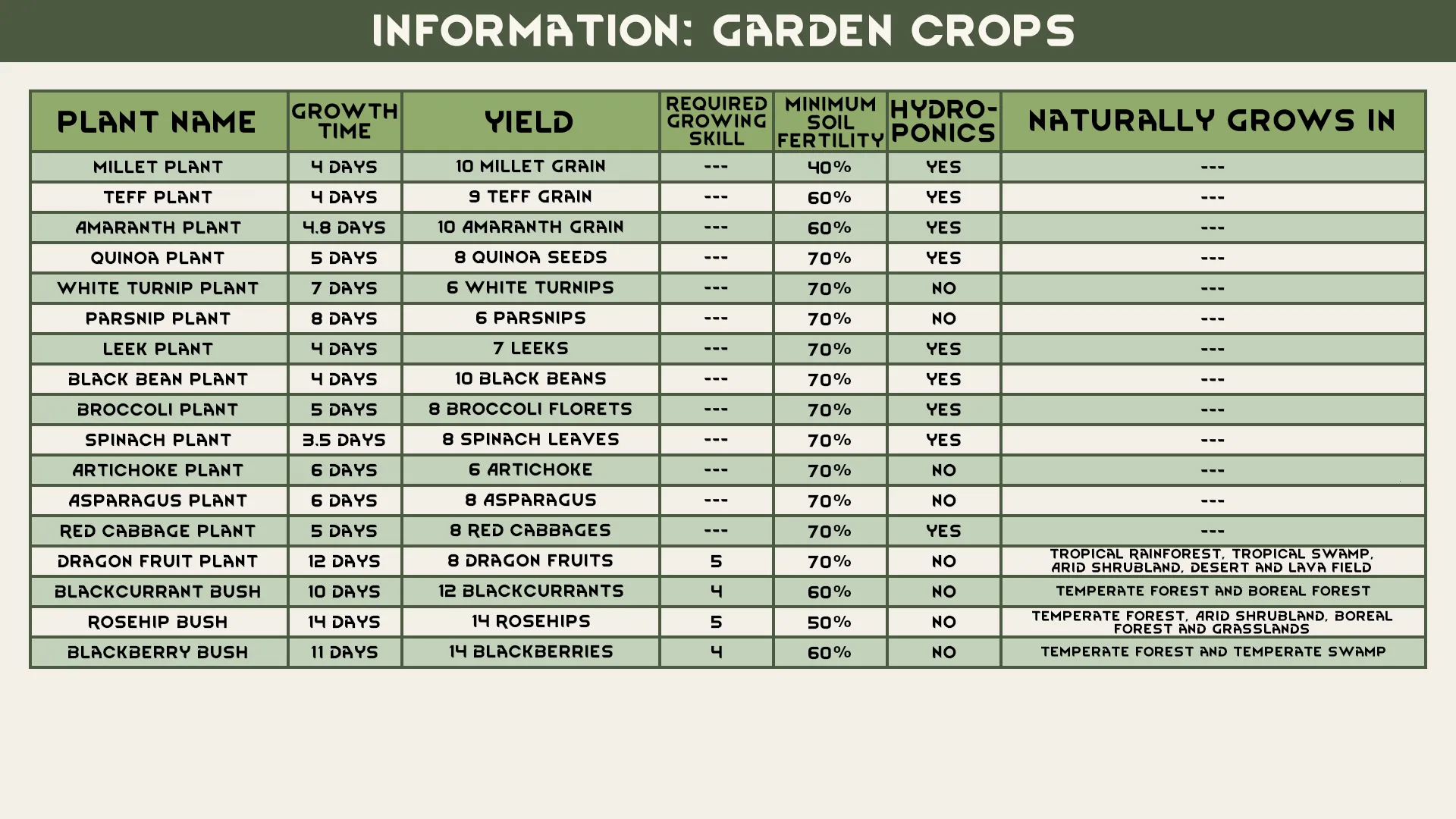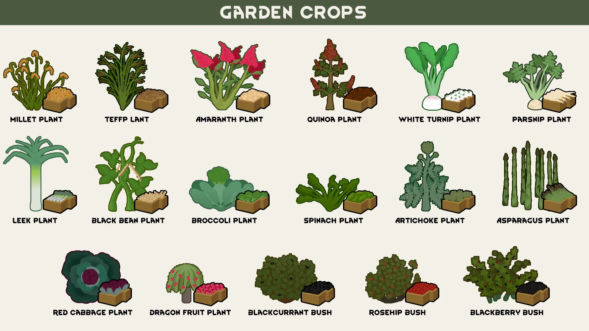 [i]Millet, Teff, Amaranth, Quinoa, White Turnip, Parsnip, Leek, Black Bean, Broccoli, Spinach, Artichoke, Asparagus, Red Cabbage, Dragon Fruit, Blackcurrant, Rosehip and Blackberry.[/i]
