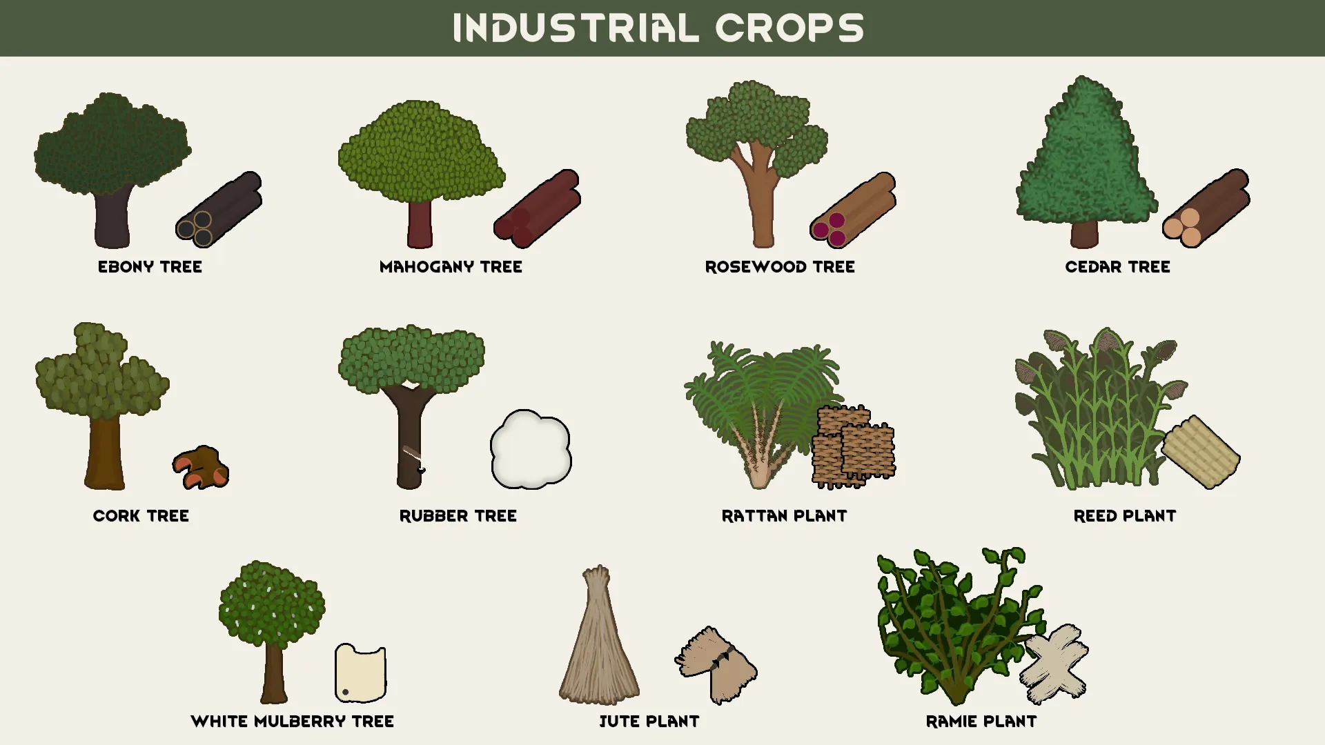 [b]Plants with great potential. These plants aren’t just eye candy - they supply fibers for clothes, tough wood for building, and a bunch of awesome materials that kick your colony’s industry into high gear.[/b]