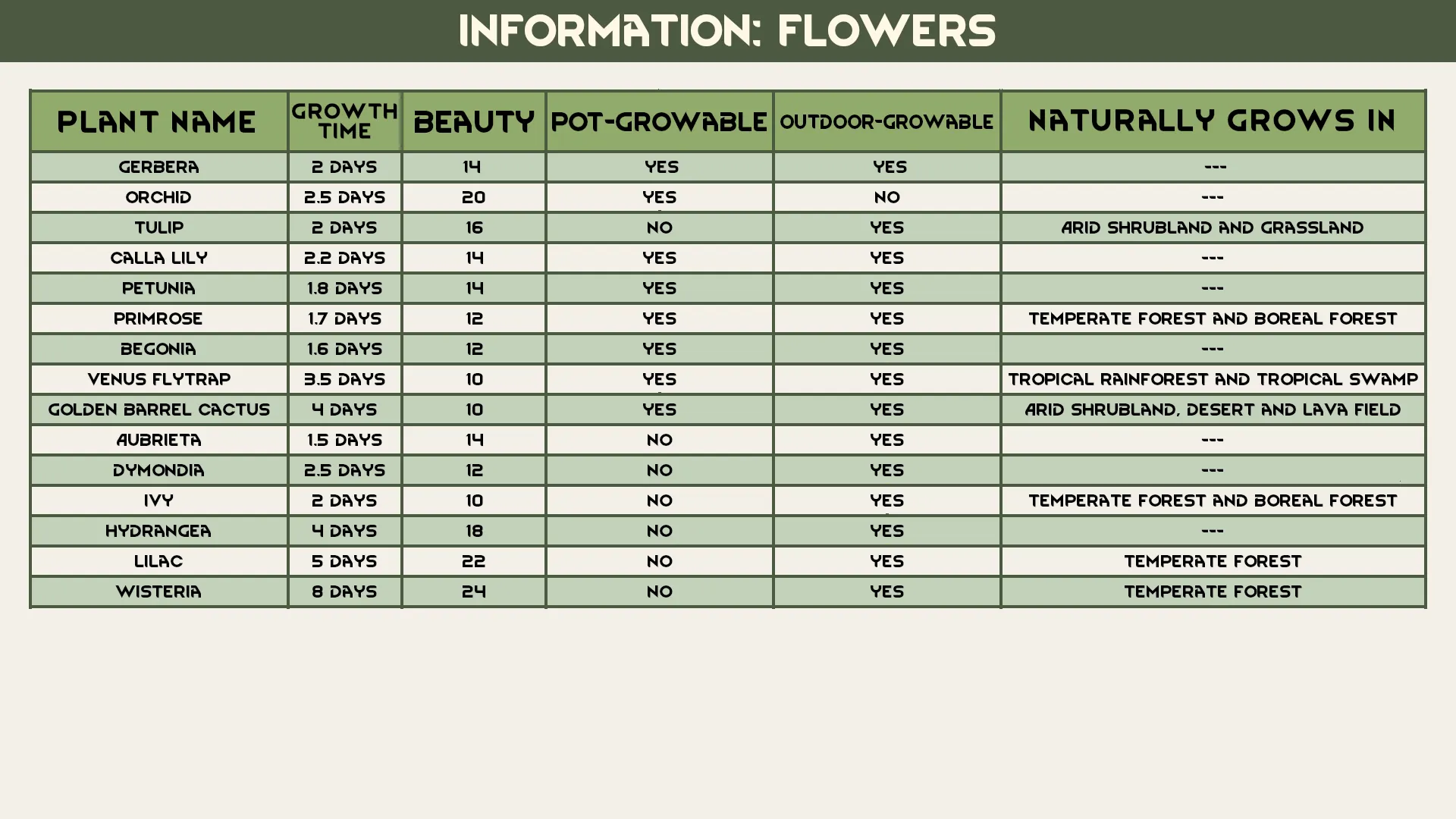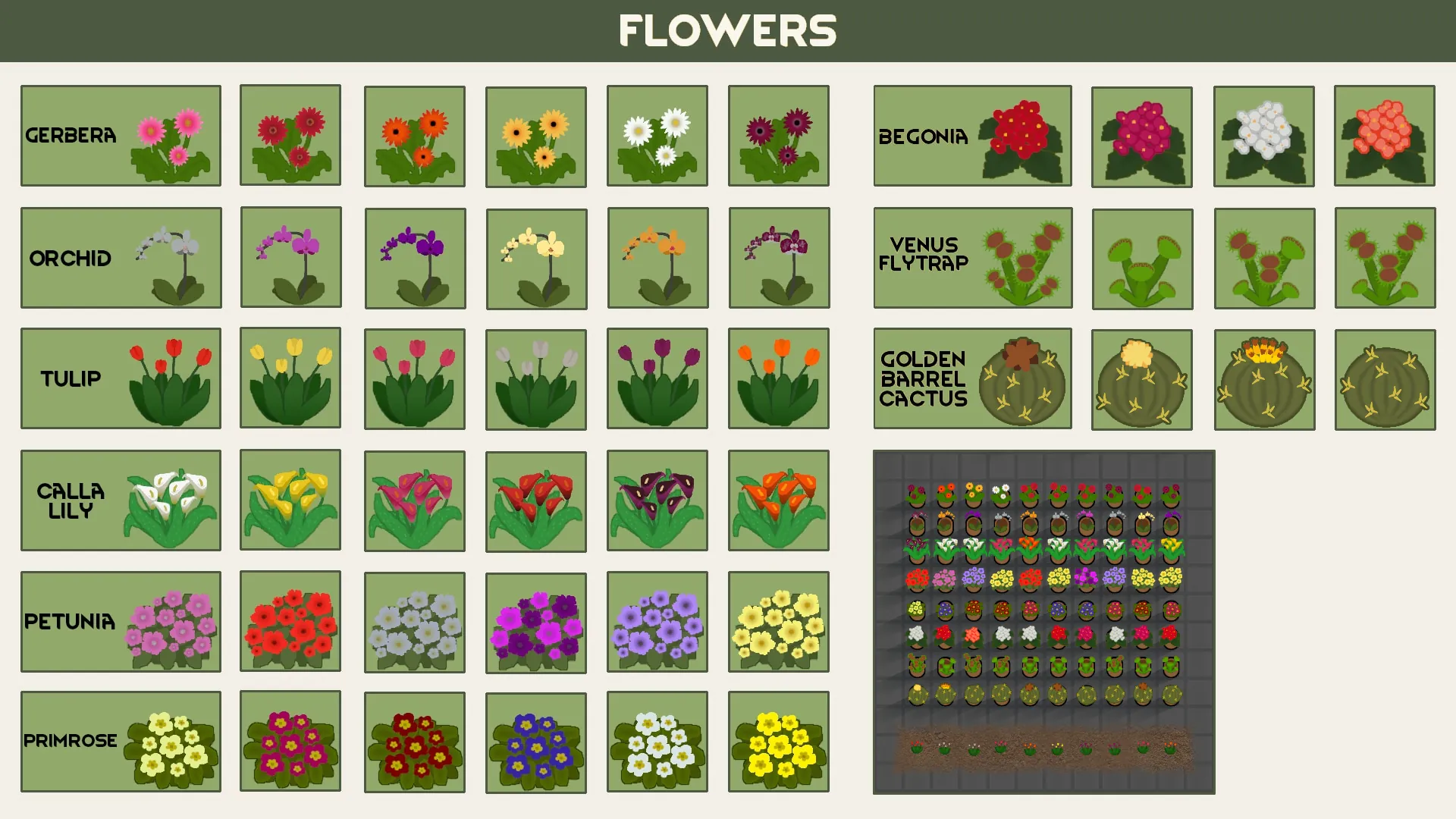 [i]Gerbera, Begonia, Calla Lily, Tulip, Petunia, Primrose, Orchid, Venus Flytrap, Golden Barrel Cactus, Aubrieta, Ivy, Dymondia, Lilac, Hydrangea and Wisteria.[/i]