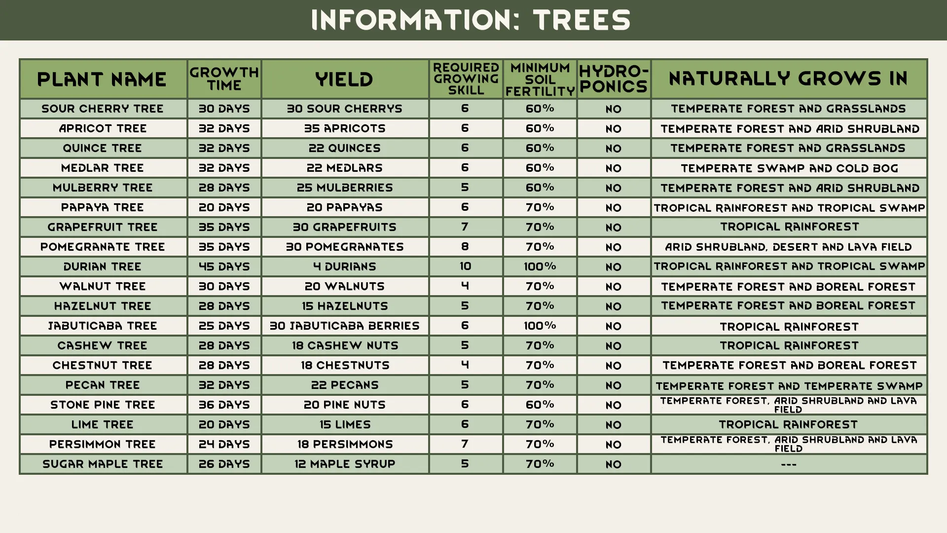 [i]Sour Cherry, Apricot, Quince, Medlar, Mulberry, Papaya, Grapefruit, Pomegranate, Durian, Walnut, Hazelnut, Jabuticaba, Cashew, Chestnut, Pecan, Stone Pine, Lime, Persimmon and Sugar Maple.[/i]