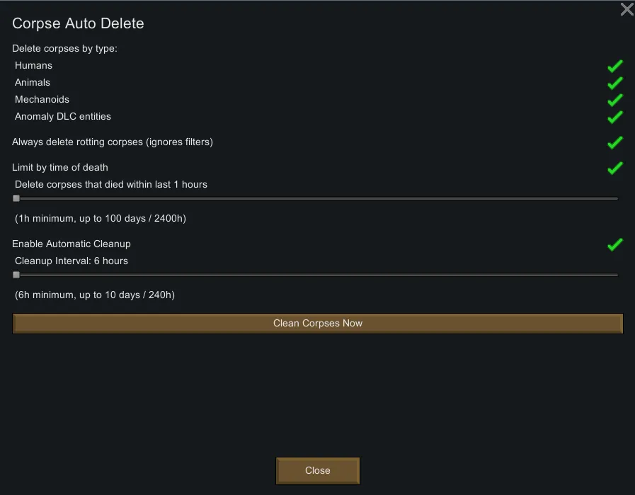 ⏳ [i]Death age filter – remove corpses that died within 1–2400 in-game hours.[/i]