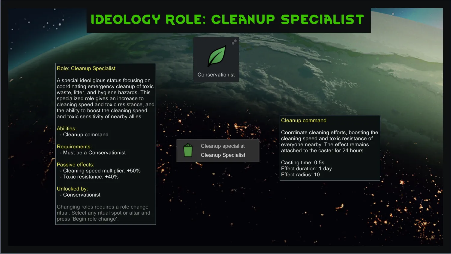[b]Conservationists[/b] seek to protect the natural world around them, and despise pollution as a result. Conservationists get a positive thought when their base is clean of pollution. They also get access to the Cleanup Specialist - a special role with faster cleaning speed, better tox resistance, and the ability to improve the cleaning speed and tox resistance of those around them.
