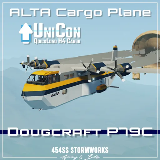 Built by (fictional) Dougcraft Avionics since 1951, the P79C has served as a reliable transport plane for delivery services worldwide. The cargo bay is outfitted for various types of cargo, featuring 4 UniCon/H4 slots or 1.5 R10 slots. The advanced cockpit features auto-pilot, auto-take off, radio and radar. The air speeds exceed 170 knots, and inner or outer bank engines can be activated individually.