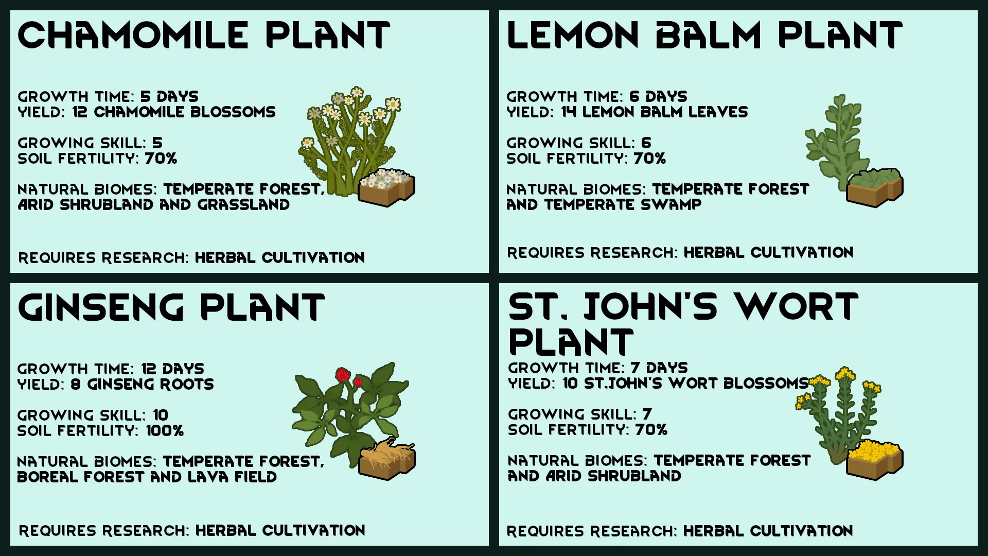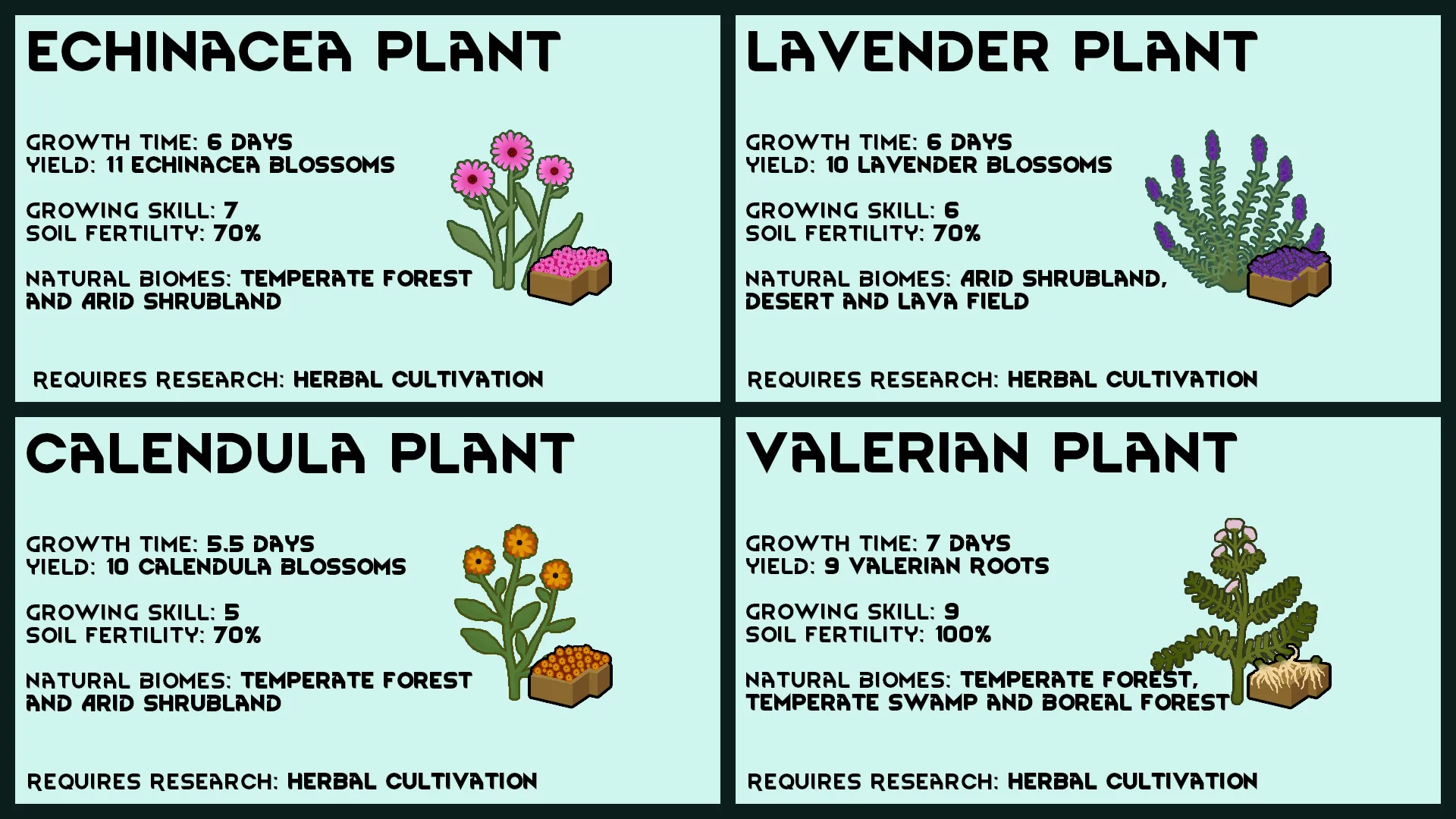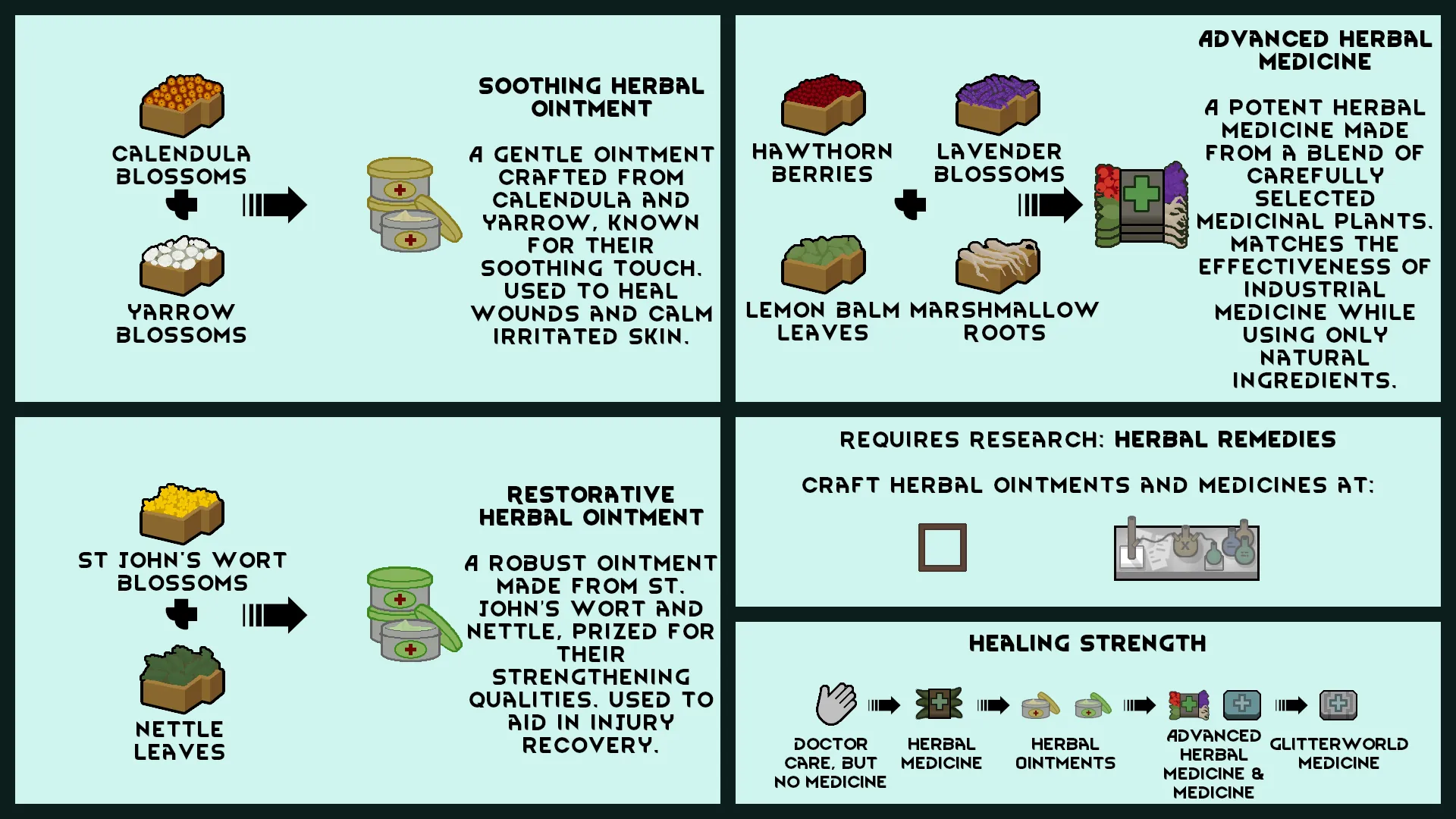 Enhance your colony’s wellness with a vibrant collection of medicinal plants. Grow herbs to craft healing teas, decoctions, ointments, and powerful herbal remedies, to keep your colonists healthy.