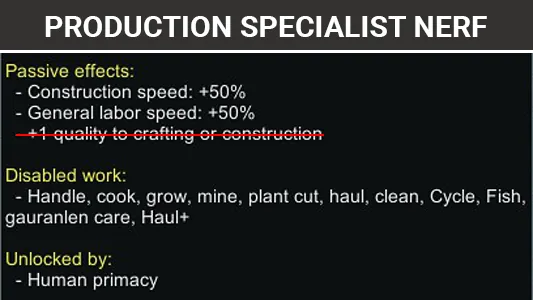 A simple patch that removes quality bonus from Production Specialist role. Why? Because with the Ideology DLC release this role allowed easy access to masterwork and legendary gear. Of cause this is highly subjective, but to me it always felt like I’m missing on something if I don’t include “Human Primacy” as one of my ideology memes to unlock production specialist. It’s like game almost forced me to take it. Also getting legendary gear from quests or exploration didn’t feel as exciting as pre-Ideology. Creativity Inspiration became almost useless as well as “Word of inspiration” psycast. In general, to me value of masterwork and legendary gear dropped a lot. That’s why I created this patch.