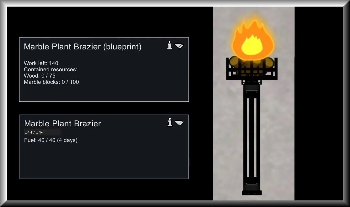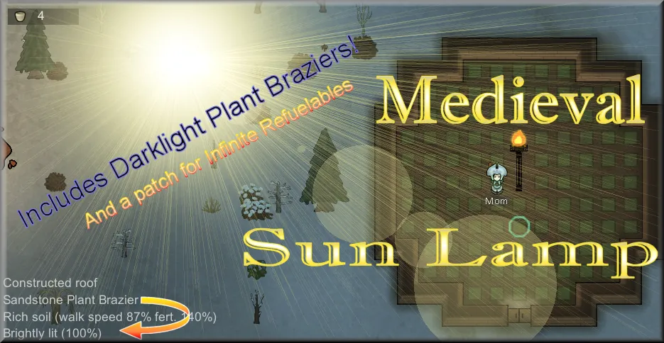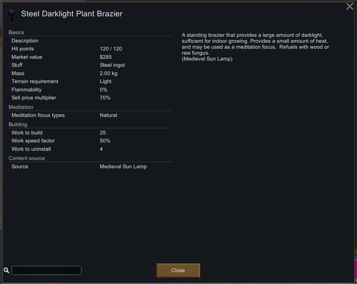 This adds a floor brazier that acts as a primitive sun lamp for medieval playthroughs. It can be made from Metal or Stone. It requires refilling (via wood) every 4 days or so**, produces a small amount of heat, and can be used as a meditation spot (because I wanted to meditate in an indoor garden).
