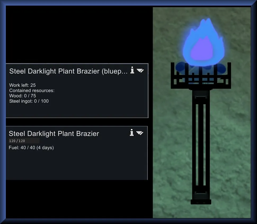 Per request, I've also added a Darklight Plant Brazier. This has a smaller light radius (grow zone radius is not impacted) and may be fueled with wood or raw fungus.