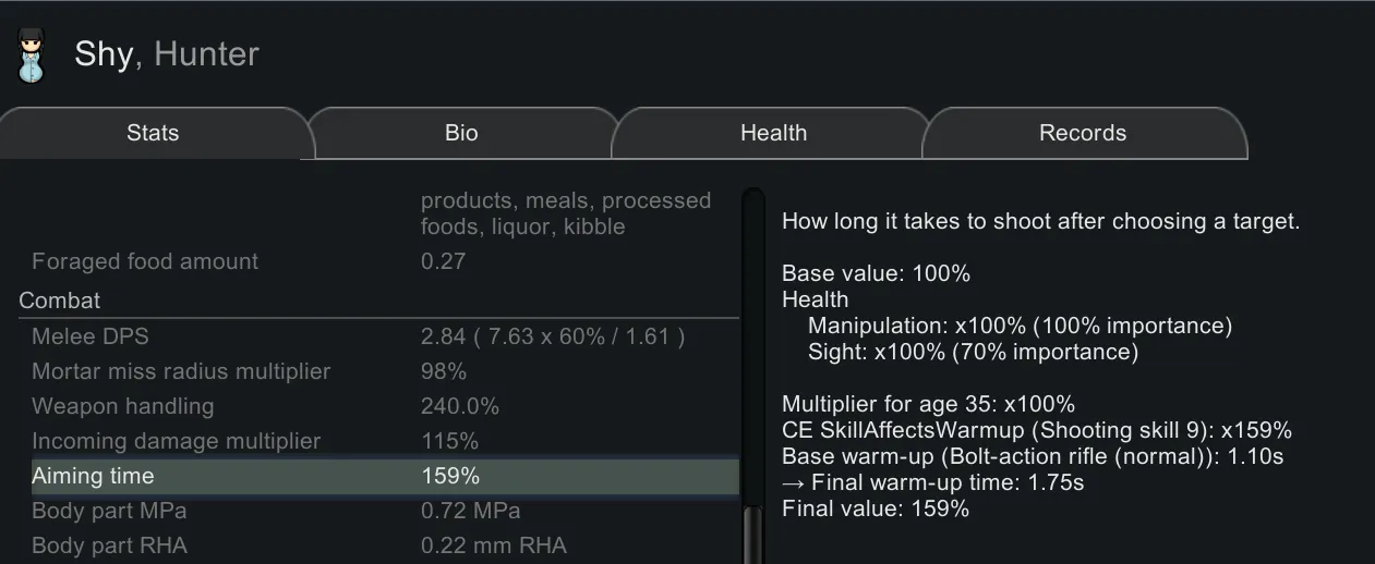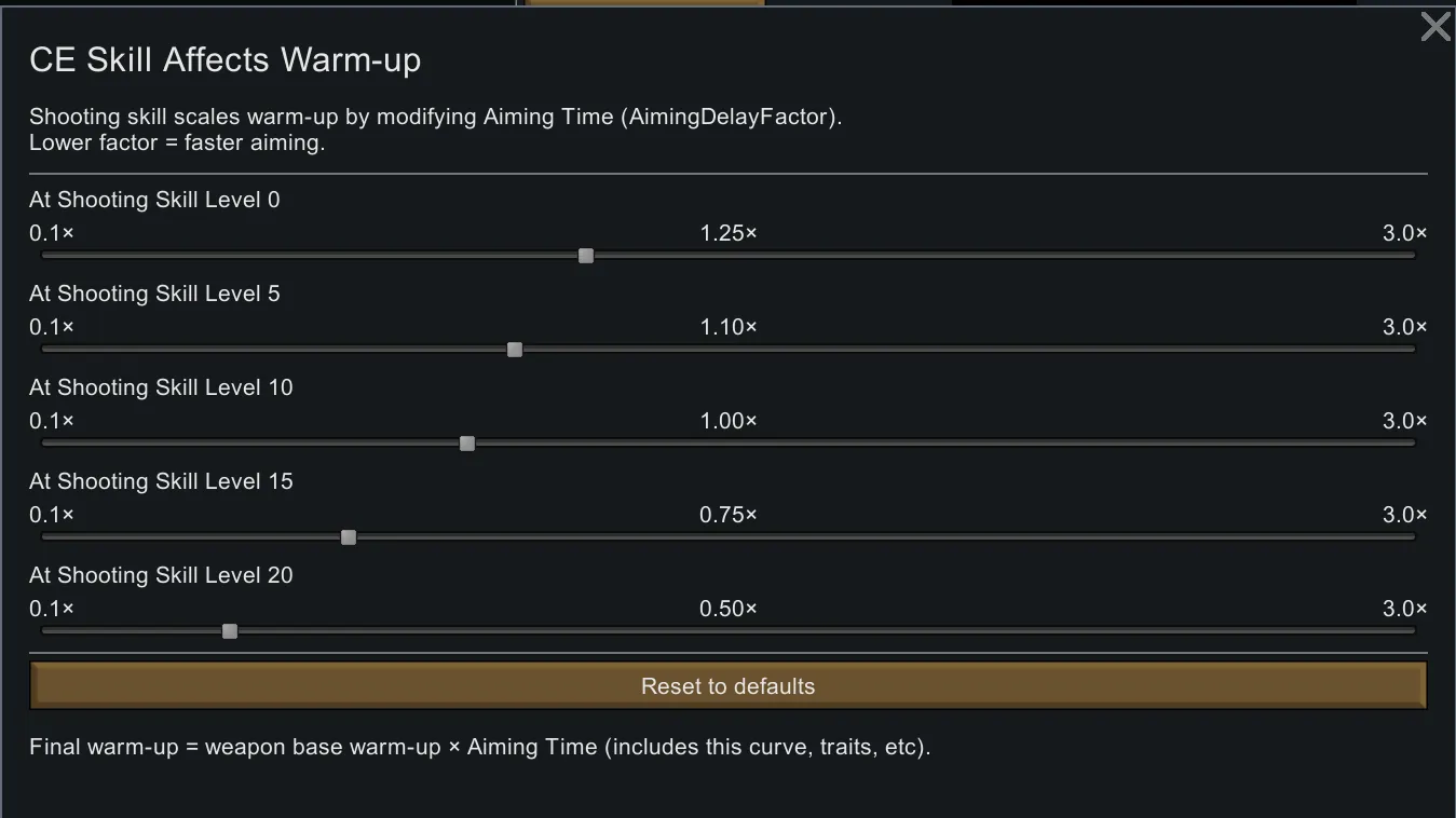 [*] This mod allows you to modify how much the shooting skill affects the warmup time (i.e. the initial time before a shot is taken) in [b]Combat Extended[/b]