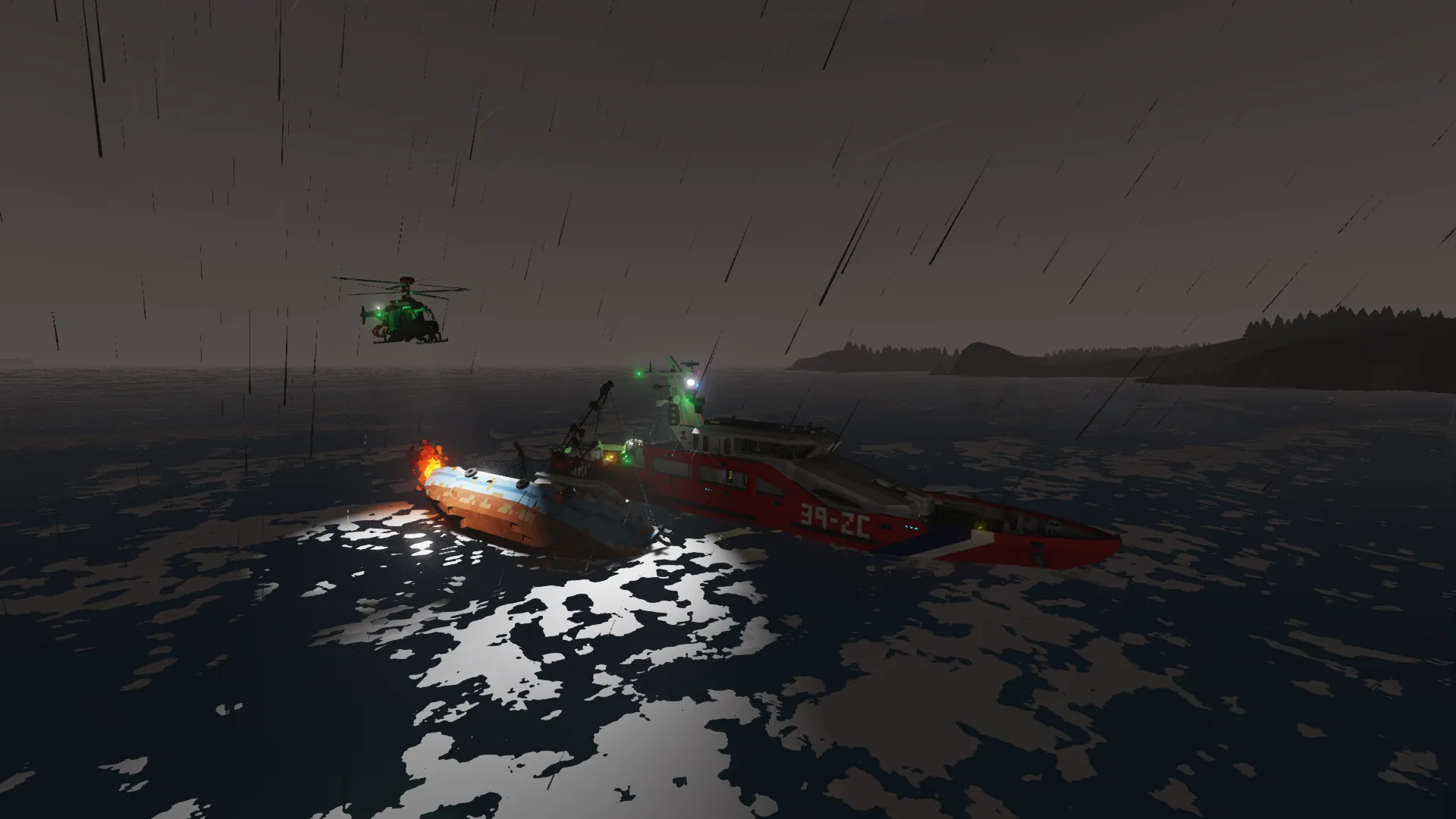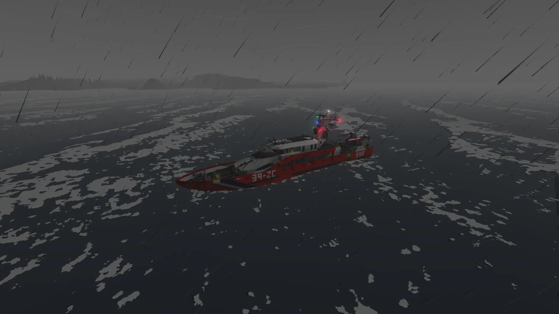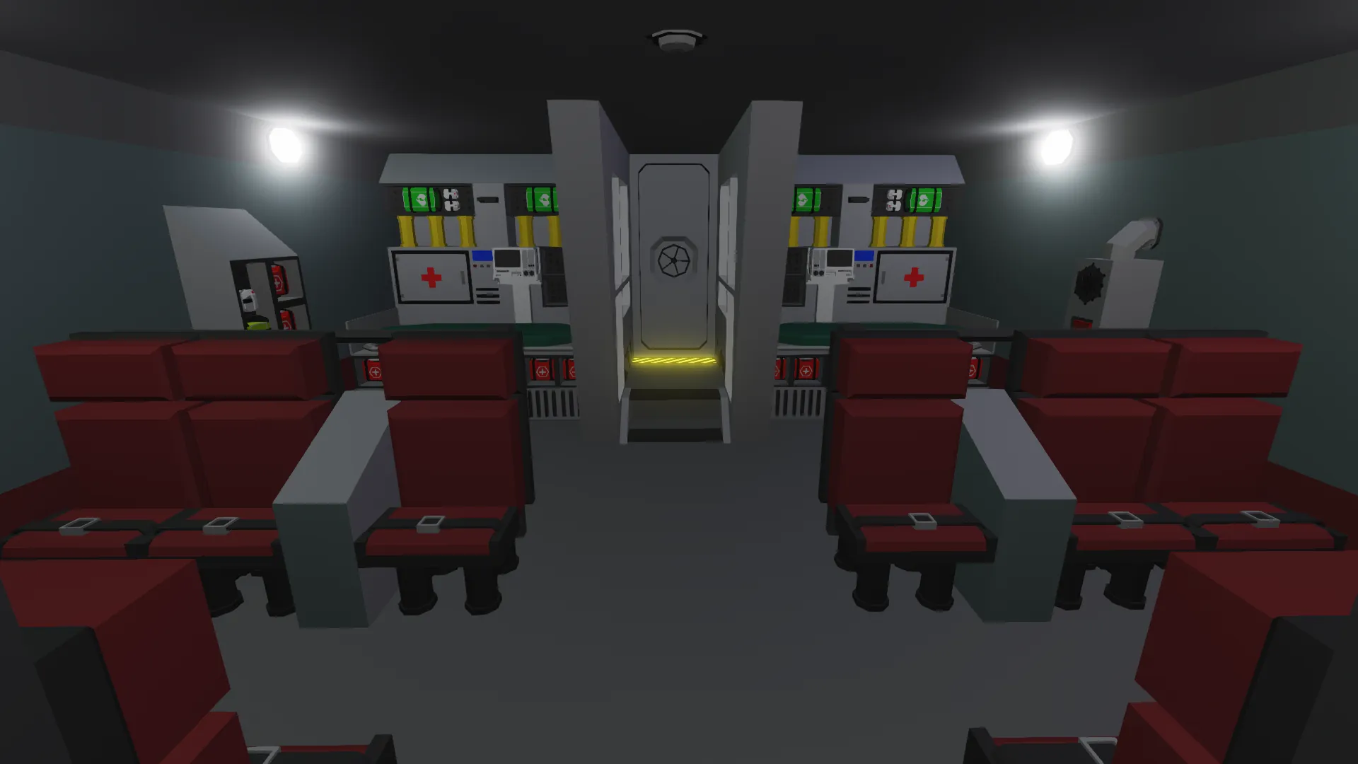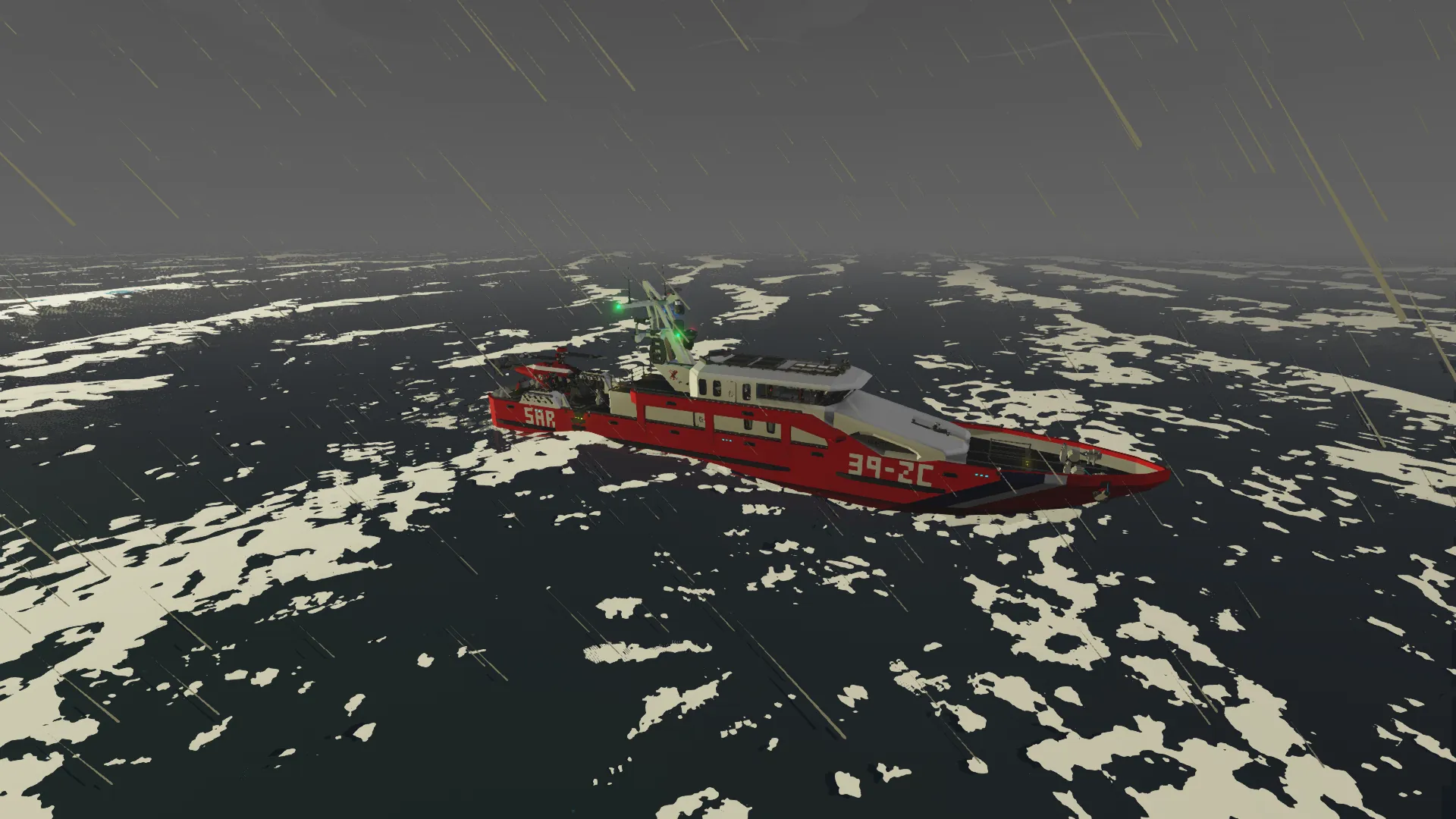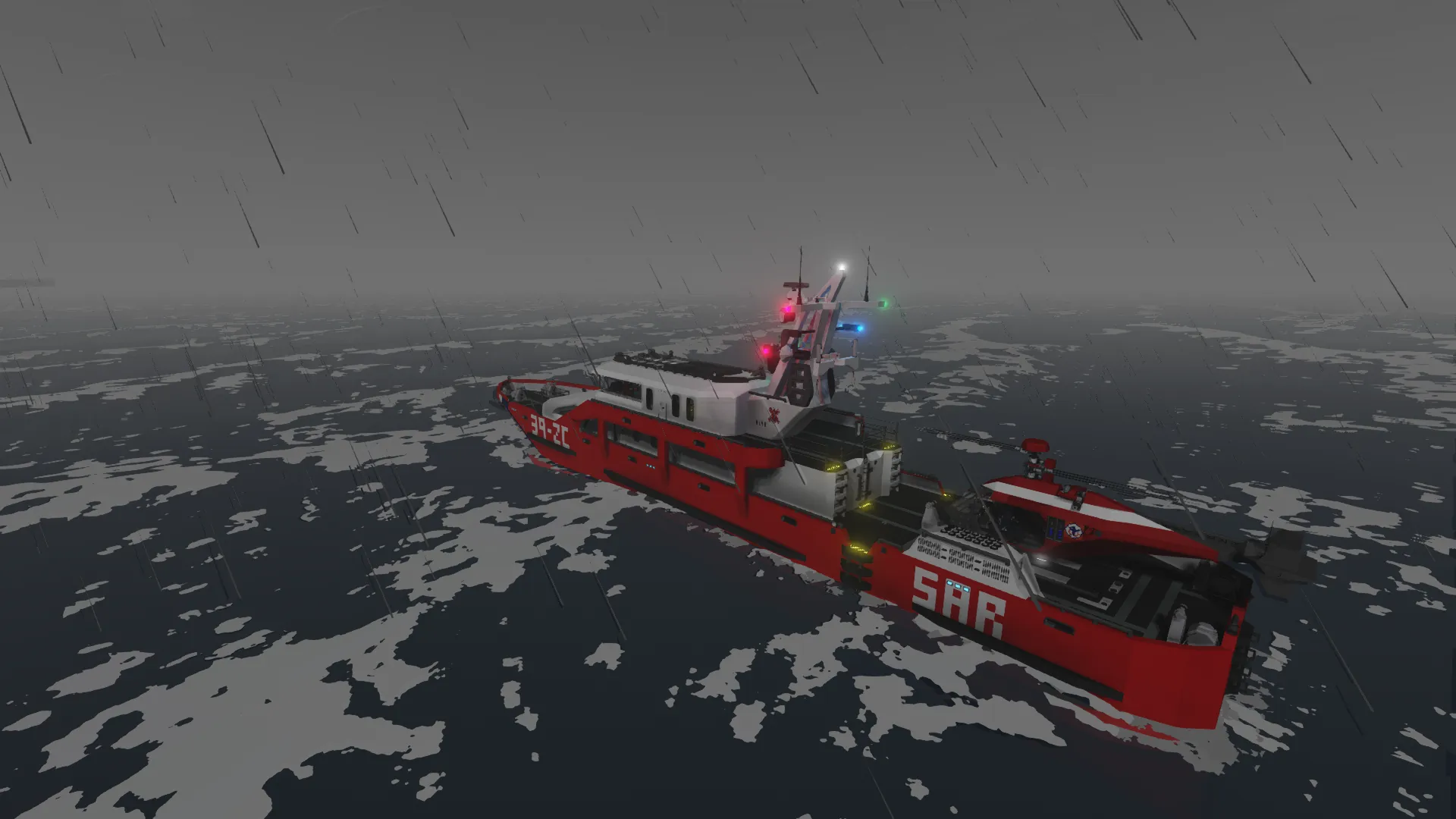 This is a nuclear powered rescue ship capable of deploying to any emergency around the map. It's power source allows it to travel for a nearly unlimited time, allowing it operate for as long necessary. It has a top speed of around 85 mph, letting it reach any destination relatively quickly for a ship of its size. It has a passenger area with two medical beds and 12 seats, a preparation room, crew cabin, cafeteria, equipment room, and more.