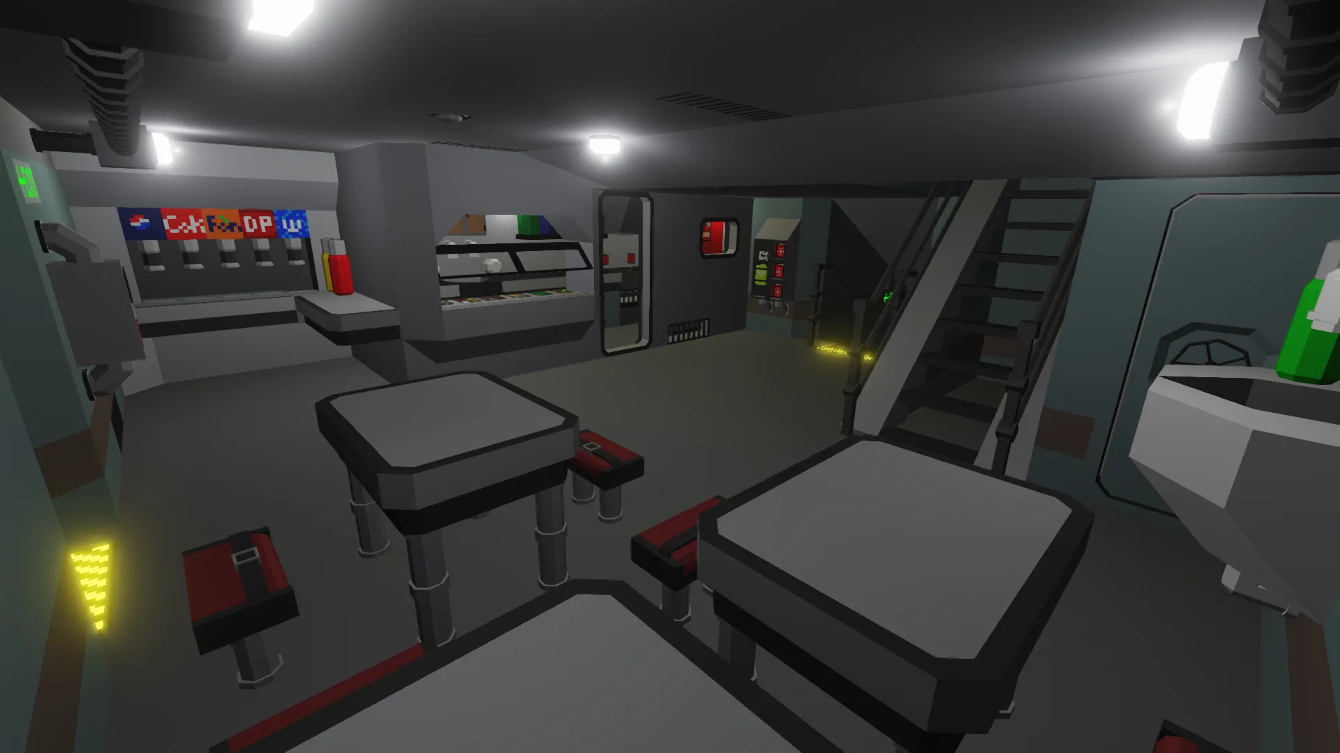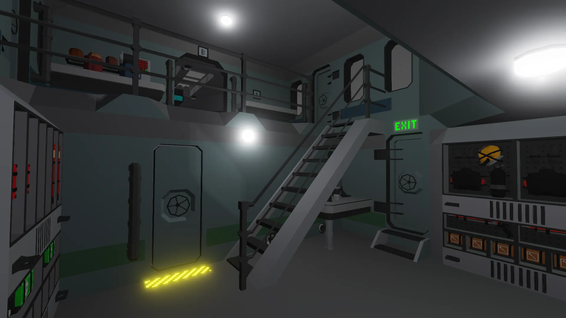 The ship has a spacious interior with plenty of room for activities. The very top deck is where the bride is located, and the middle deck contains the passenger area, preparation room, and cabin areas. The next lower deck is where the cafeteria, bathroom, shower/laundry room, and armory are located (for the more intense situations). The armory room code is found on the bulletin board in the cafeteria. The very bottom deck houses the repair room, supply room, and engine room. The station just in front of the engine room has a camera that views the nuclear reactor to see whether it's damaged or not without risking the player.