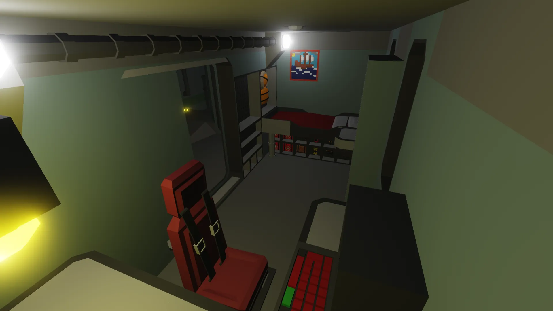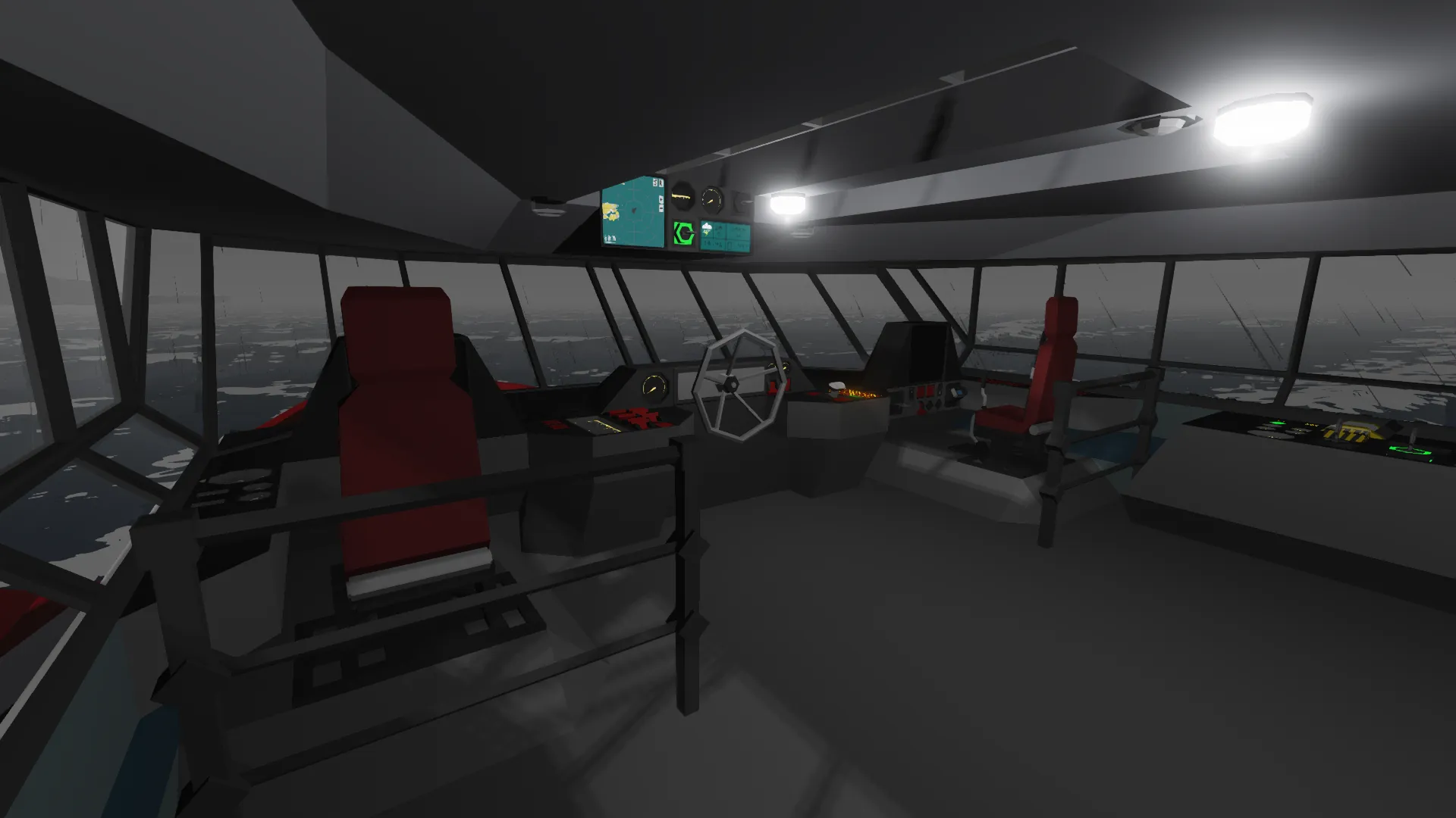 Starting at the bridge, there are a few different seats that control different things. On the left side lies the camera and spotlight operator, which controls spotlight and infrared camera located on the radio tower. On the right side is where the radio operator sits, transmitting and receiving both radio and video frequencies. The wheel in the center pilots the boat as well as controls the water cannon on the front of the ship (this uses look controls). This is also where the bridge unicom can be used to communicate to any room inside the ship. All the exterior light controls and siren are also activated from this position, on the left. The autopilot is located on the right.