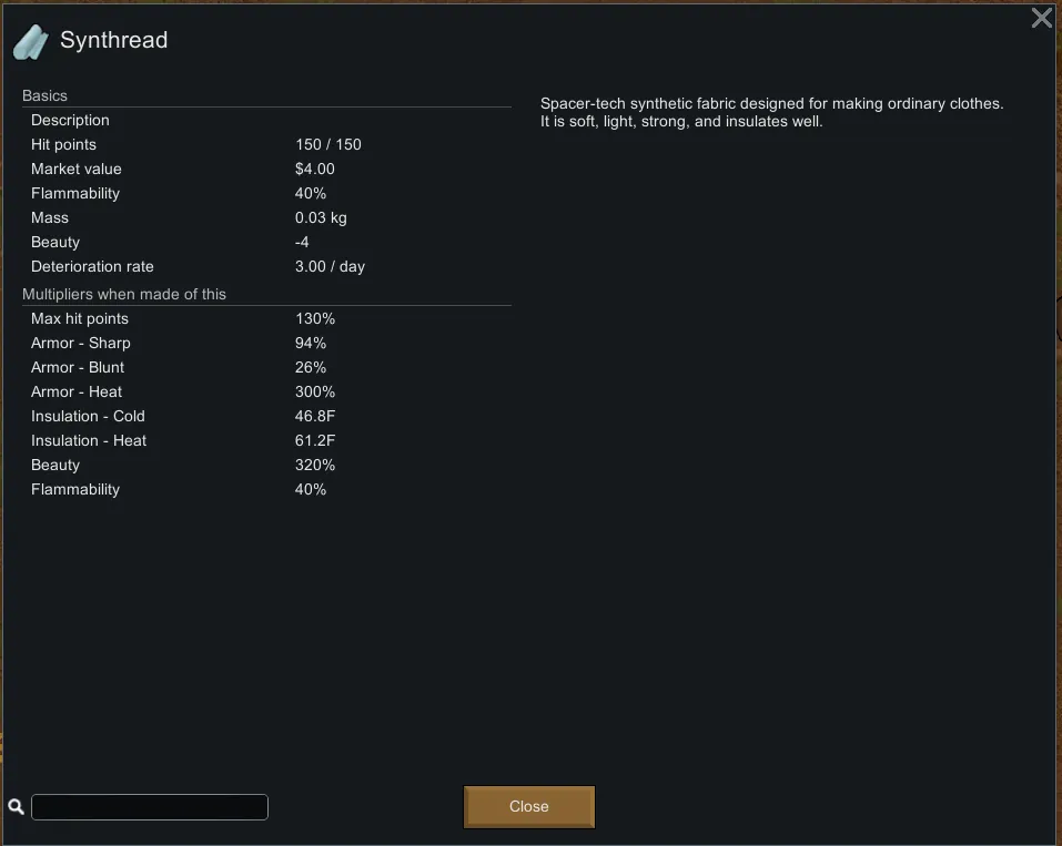 I always liked Synthread conceptually and was saddened by its sub par stats which means it never gets used in game. My idea is that this is the stuff Starfleet uniforms are made of and will keep you comfortable whichever biome your new gravship takes you. Increased the temperature insulation to be on par with Hyperweave (cold) and Thrumbomane (Heat). Decreased the flammability and increased heat armour to be the same as Devilstrand. I also really liked the colour of Synthread so I increased the beauty to be the same as Devilstrand which I think also gives it a niche as a furniture material.