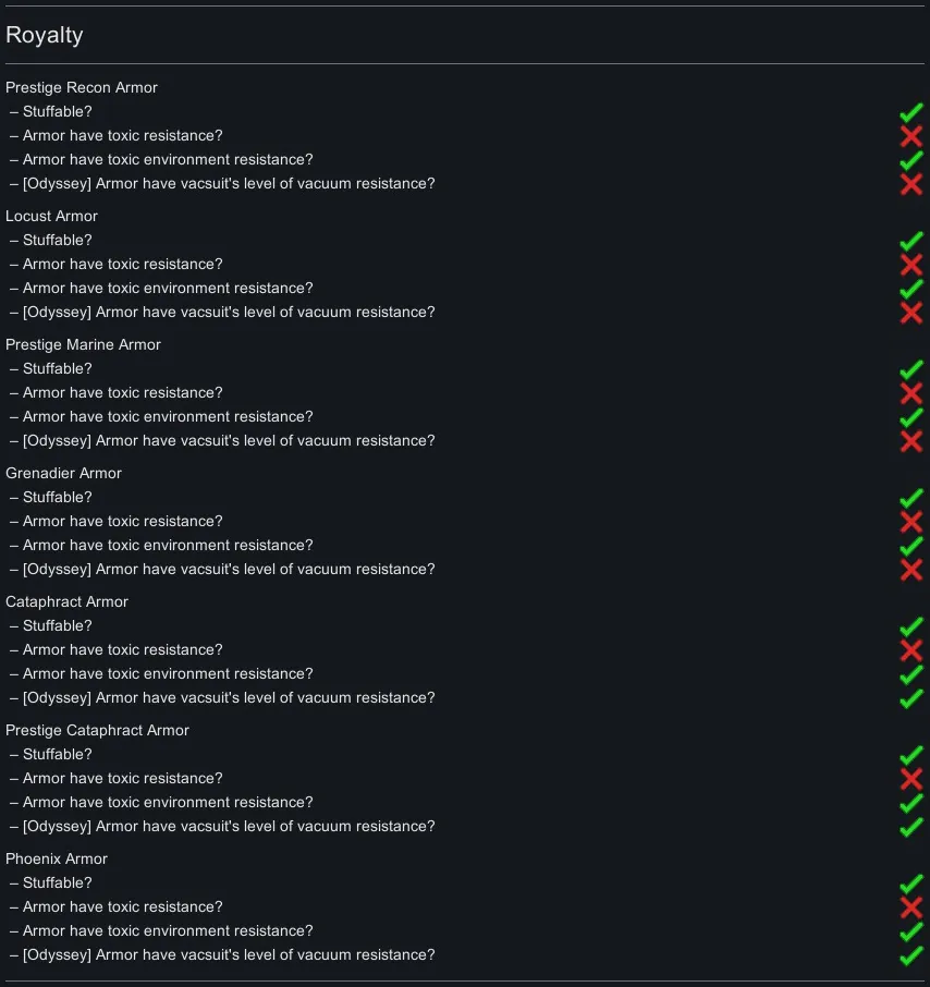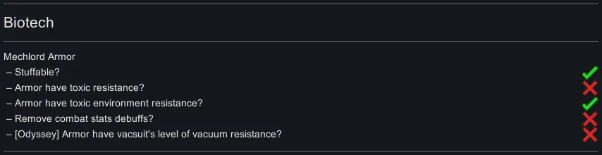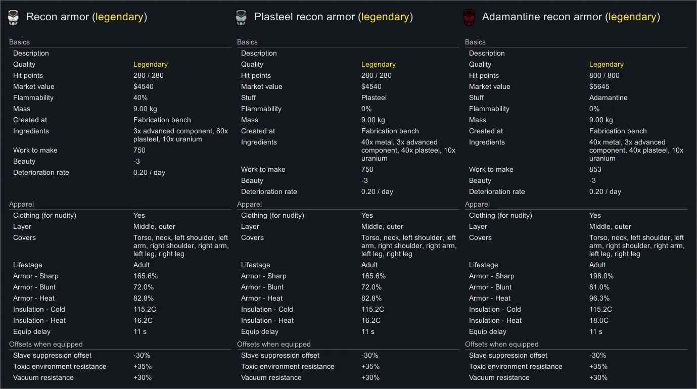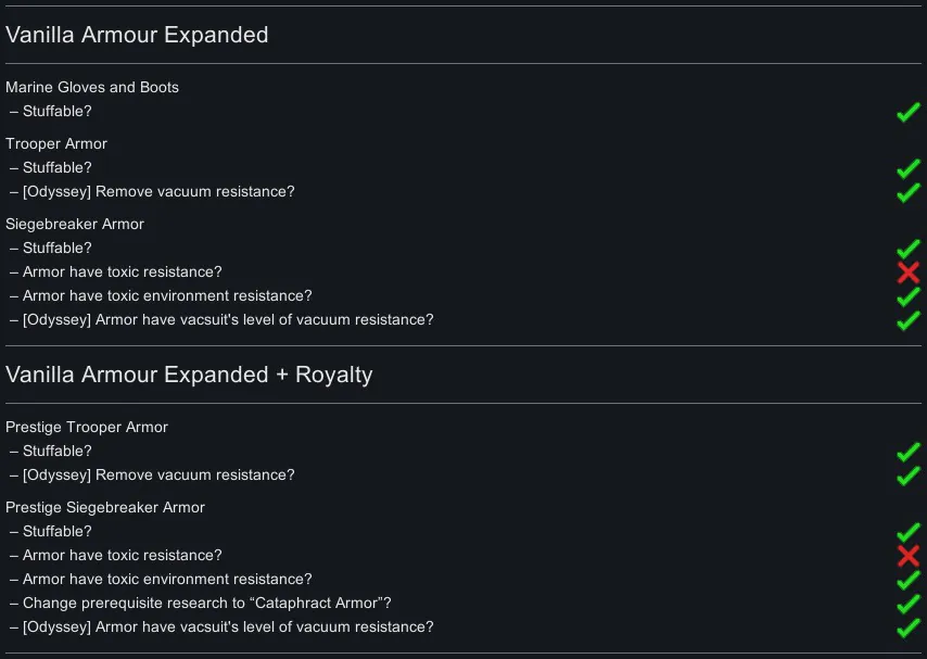 As mod name suggests this series of patches mainly focuses on making armor stuffable and adding toxic / toxic environment resistance. It never made sense to me that futuristic power armor doesn’t have any environmental protection. So, what about balance? I decided to split plasteel cost of armor in half between plasteel and stuff material, and also to separate armor rating into flat and stuff bonus. I balanced it around plasteel stats because it’s armor main material. The idea was that only the outer plating is stuffable in power armor. Let’s look at a marine armor as an example. Vanilla sharp armor is 106%, so with stuffable patch it will become 49% flat + 114%/2 (plasteel) = the same 106% as a vanilla one. Same with cost, it will become 50 plasteel + 50 stuff material instead of 100 plasteel. So, if you use plasteel as a stuff material then patched marine armor will have exactly the same stats and material cost as a vanilla one. But if you stuff it with adamantine than its sharp armor will become 49% flat + 150%/2 (adamantine) = 124%. Simple, right? If only writing those patches was as simple as it sounds… it was very tedious… and turning this mess into a proper mod with actual togglable options almost drove me mad. So, plz don’t bug me with requests to patch your favorite mods! I will mostly ignore them.