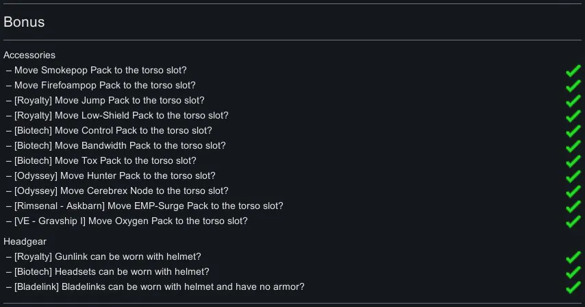 I had some other gear-related patches and decided to add them as a bonus. First section is a lightweight alternative to [url=https://steamcommunity.com/sharedfiles/filedetails/?id=2509511179]Packs Are Not Belts[/url] mod. After Rimworld 1.4 release I’ve got fed up with its bugs and lack of proper support, so I wrote those simple xml patches to get rid of it for good. Second section is essentially a [url=https://steamcommunity.com/sharedfiles/filedetails/?id=2500705510]Gunlink with helmet[/url] analog but with support for Biotech headsets.