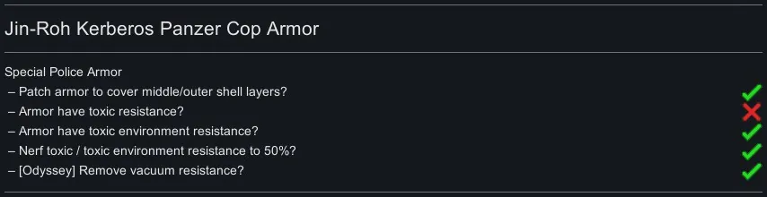 [*] [url=https://steamcommunity.com/sharedfiles/filedetails/?id=2038994354]Jin-Roh Kerberos Panzer Cop Armor[/url] ([i]No stuff patch, only some balancing patches[/i])