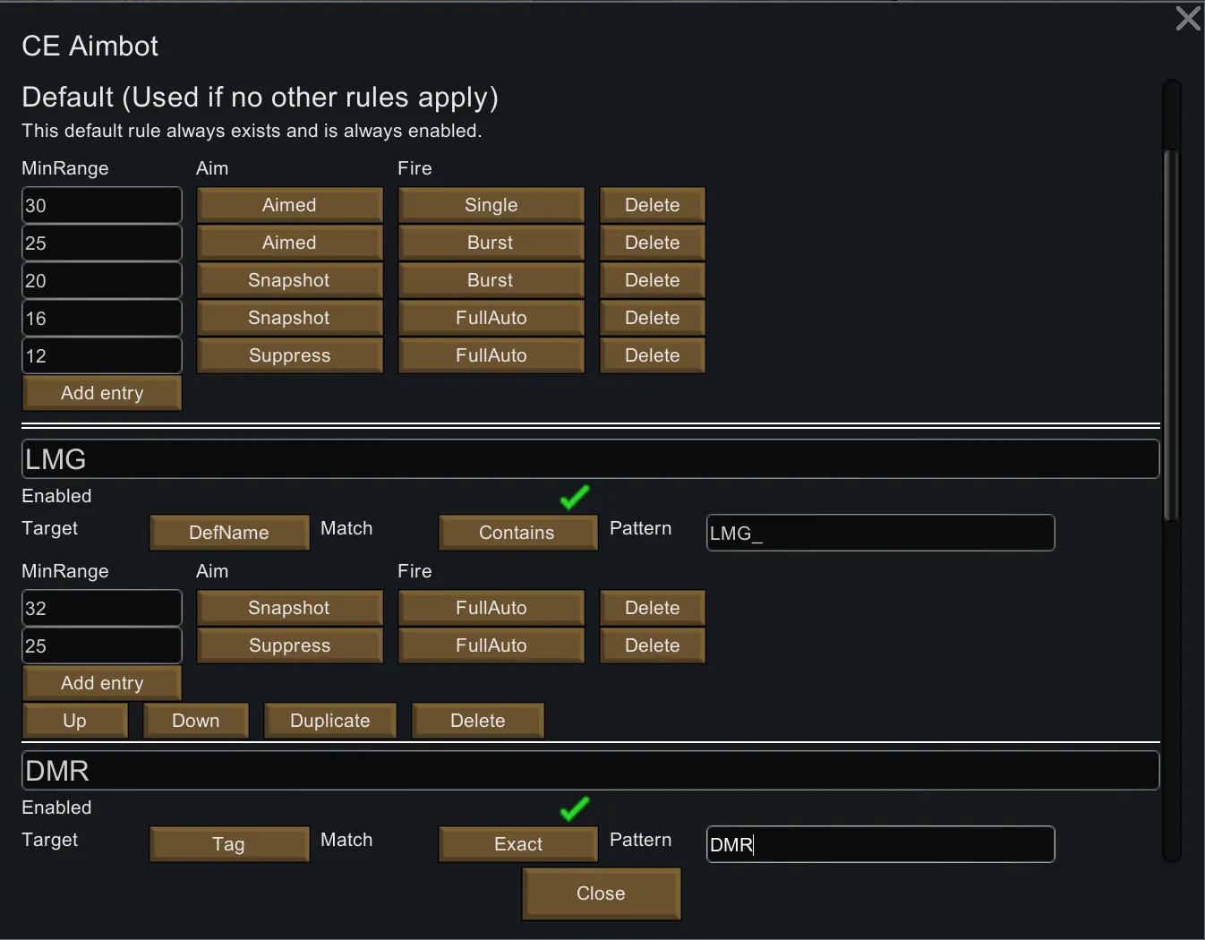 [*] This mod adds an aimbot (a helper algorithm) to [b]Combat Extended[/b] that automatically sets the firing mode (single, burst, auto) and aiming mode (aimed, snapshot, suppress)